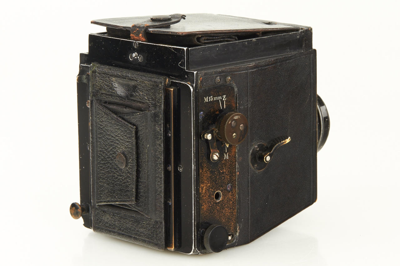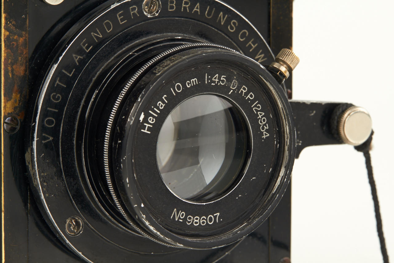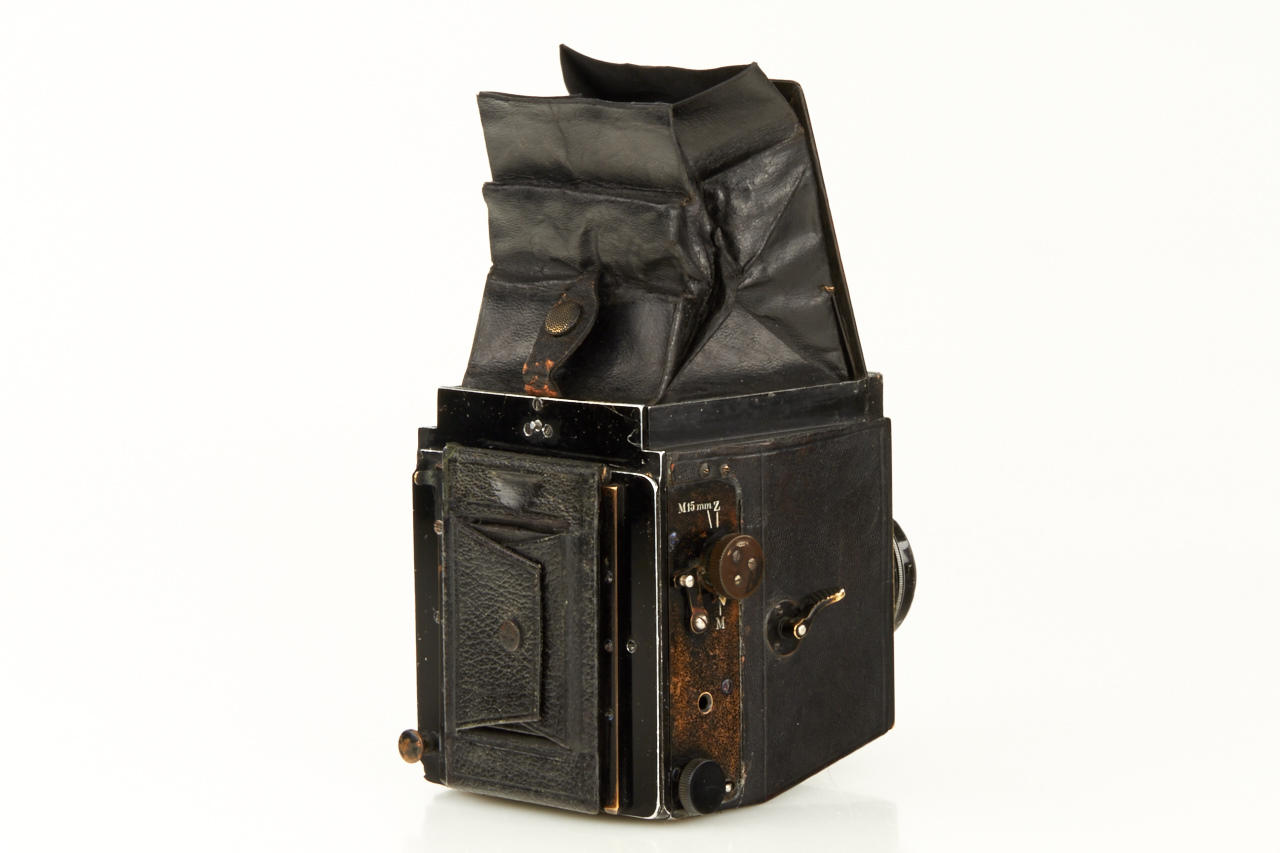 very rare, first miniature SLR for 4.5x6cm plates in good original condition, working focal plane shutter with Heliar 4.5/10cm no.98607 in helical focusing mount, original front cap