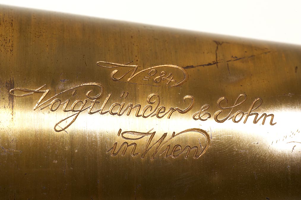 official Voigtländer replica produced in 1956, for 80mm round images, lacquered brass body engraved 'No.84 Voigtländer & Sohn in Wien', Petzval 3.7/149mm lens with rack and pinion focus, on adjustable stand