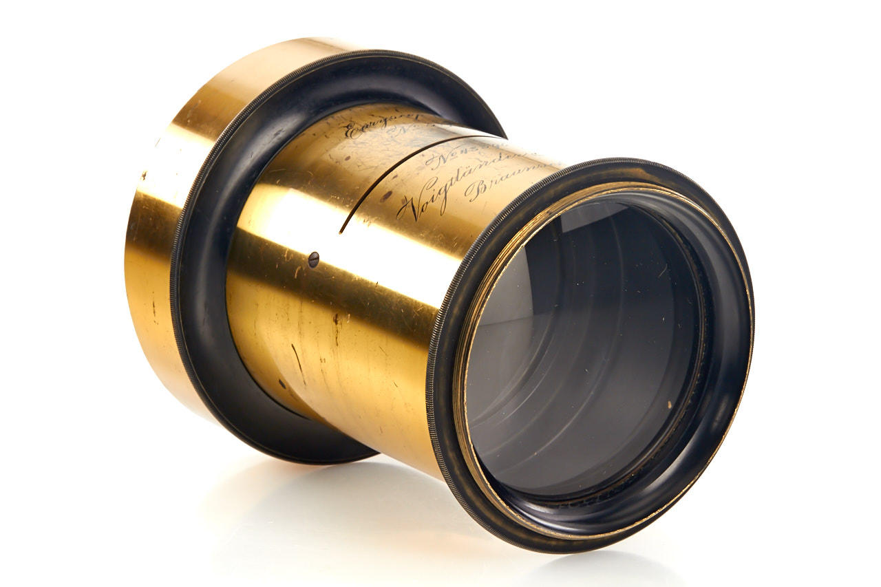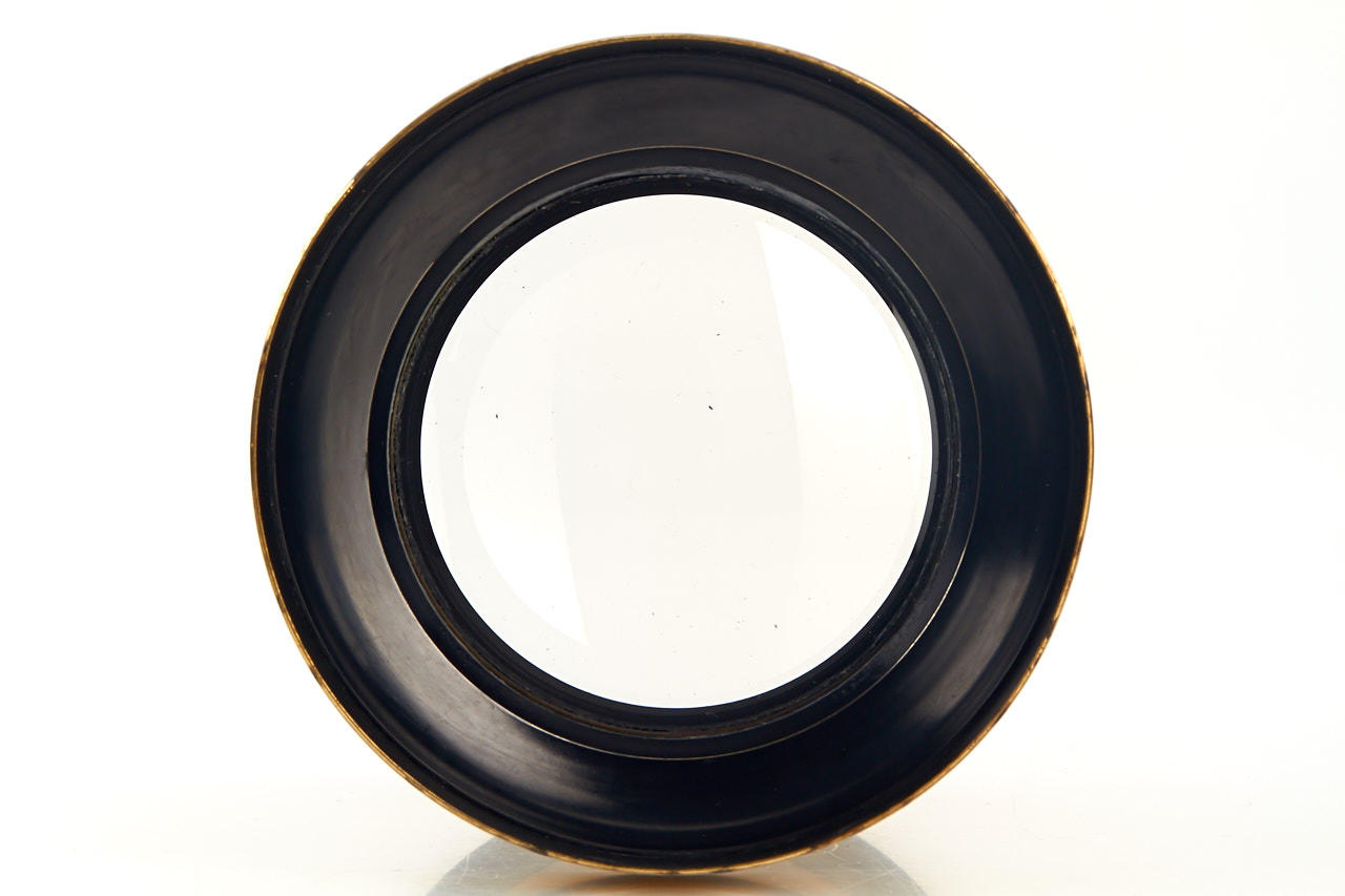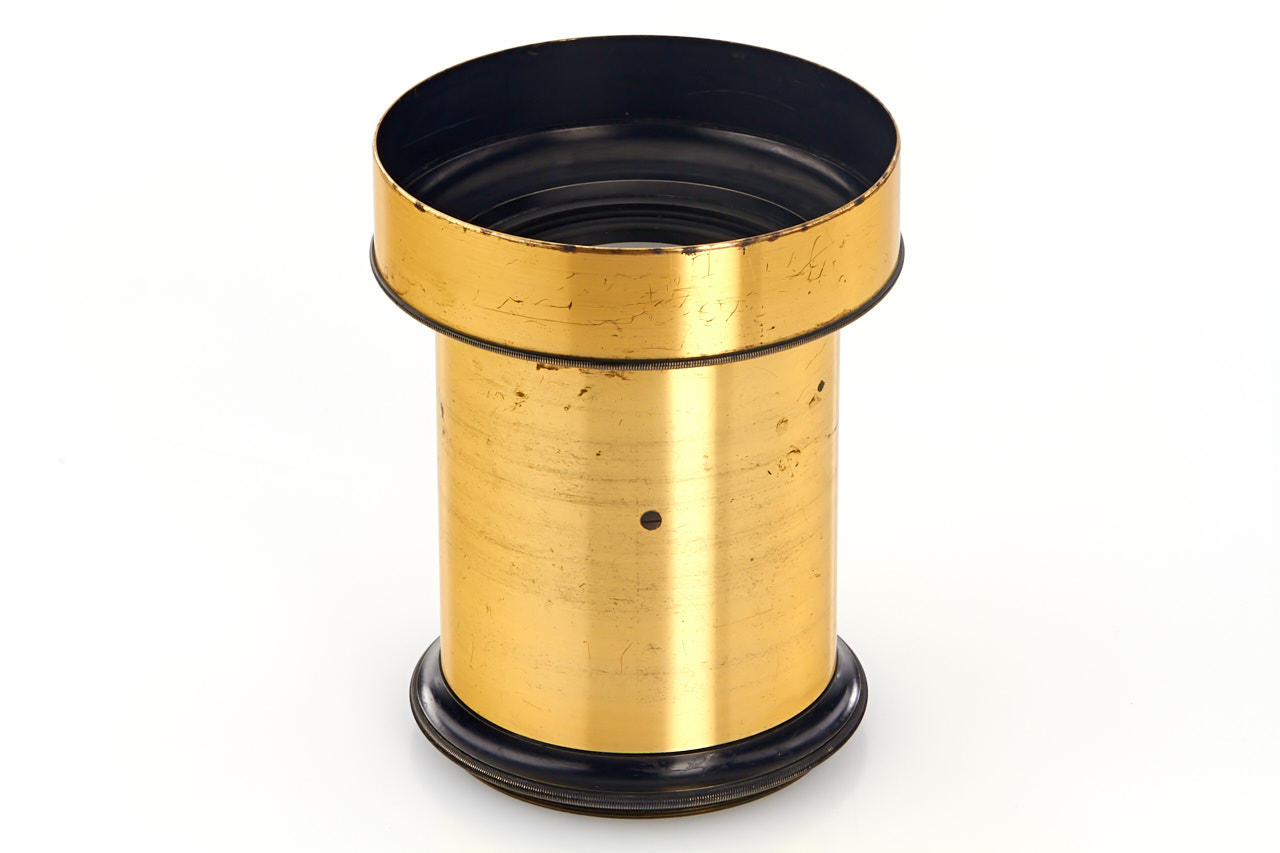 brass large format lens, large coverage of c.14x17", total height 14cm, with slot for Waterhouse stops, very good, clean optics