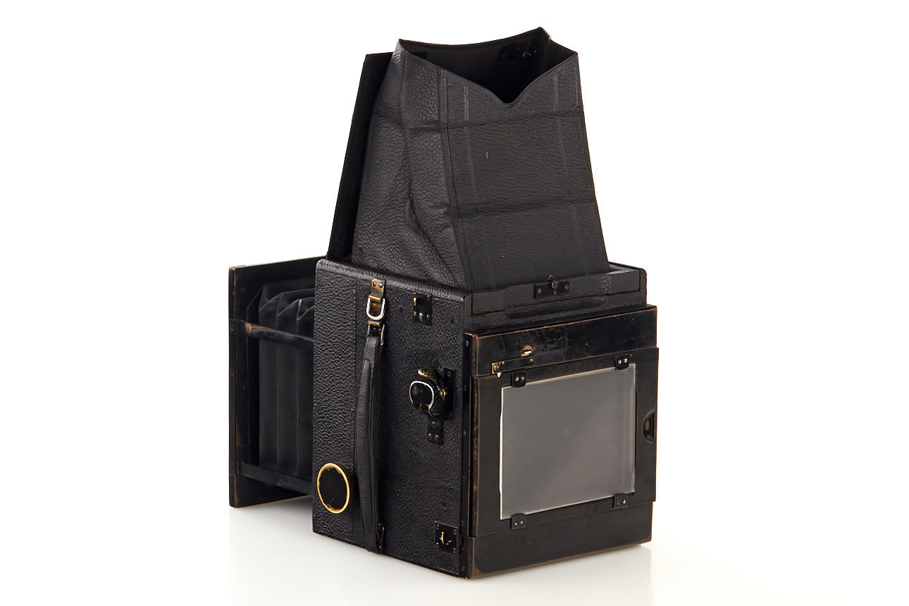 rare 9x12cm reflex camera, made for Voigtländer by Bentzin, black, leather-covered body, focal plane shutter, with fast Heliar 3.5/21cm no.169240 (very good, clean optics)