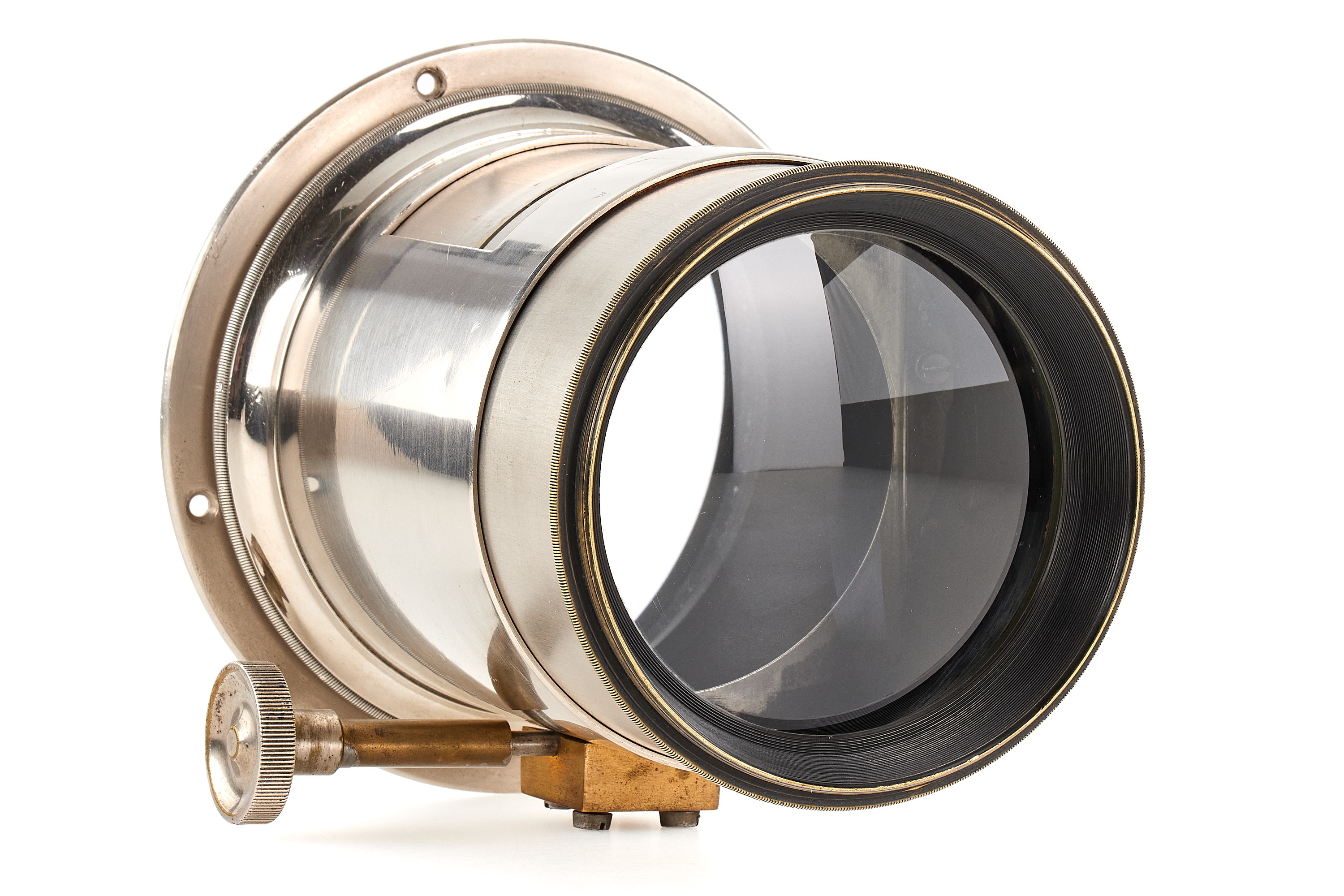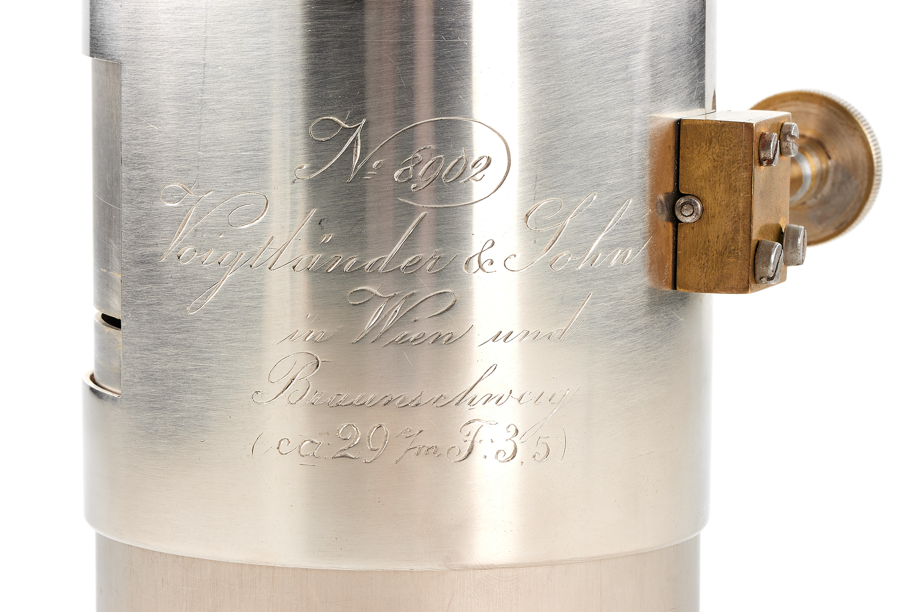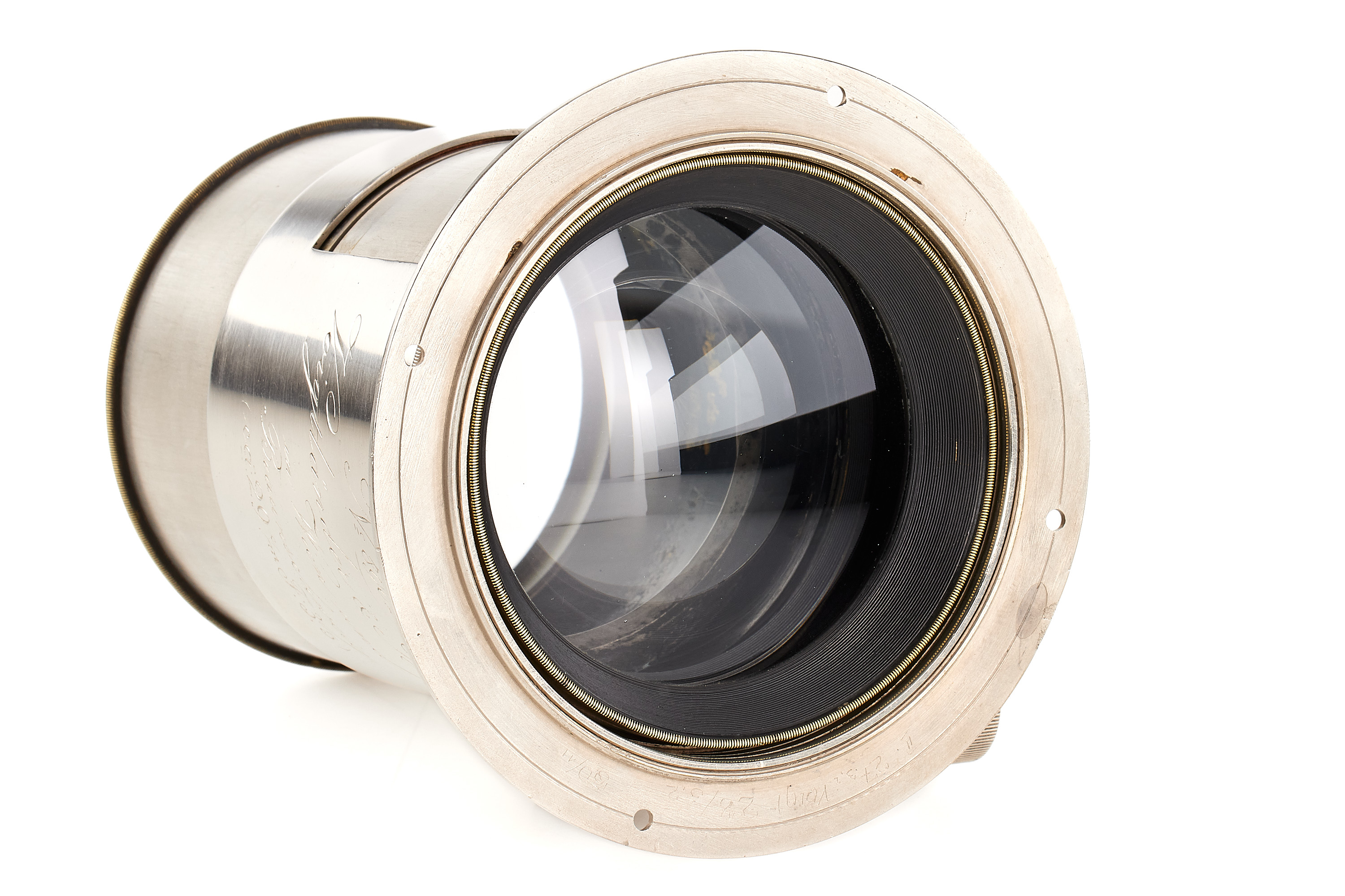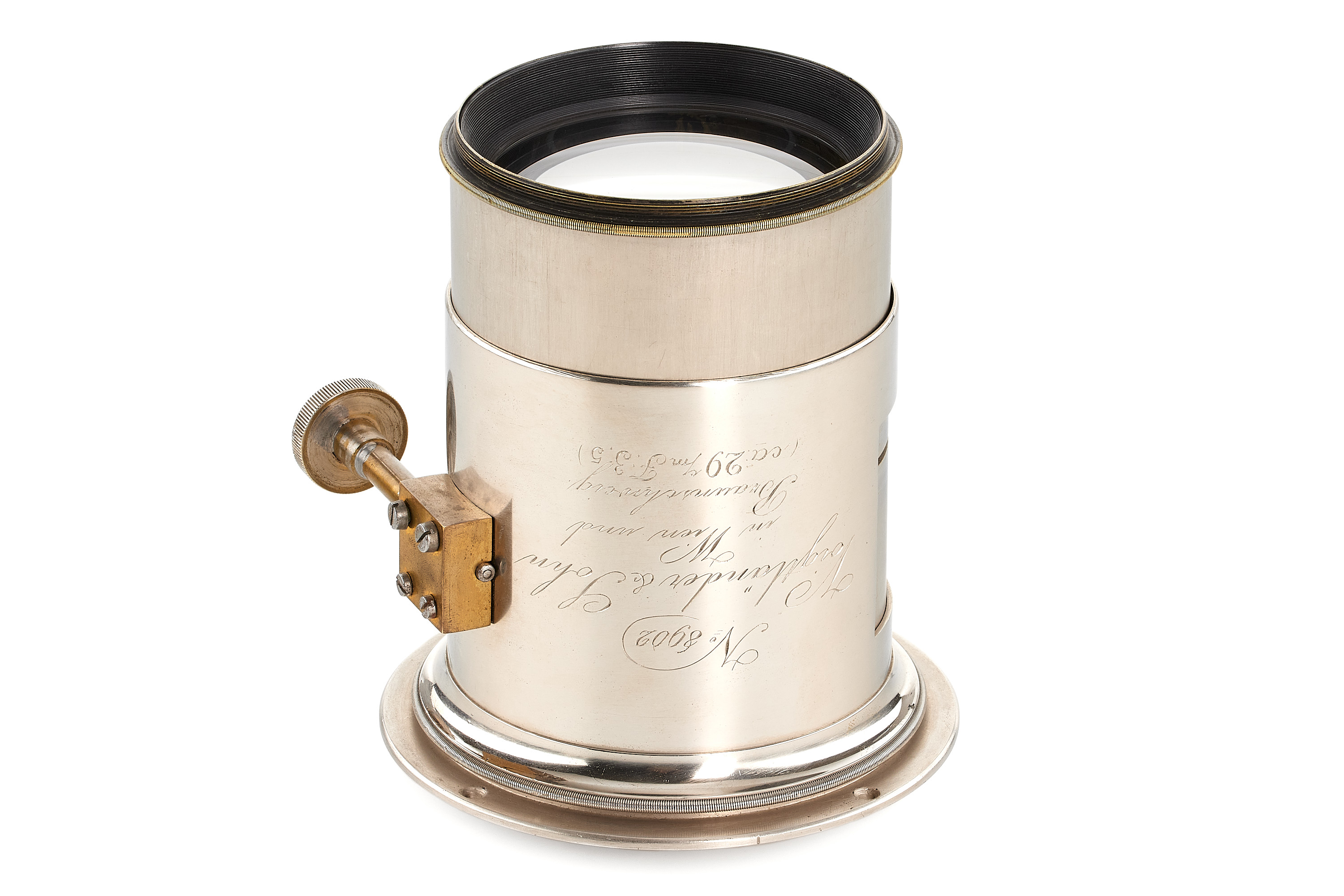 Very early 1860 Petzval ca.29cm f:3,5 lens by Voigtländer, in very good condition, with good optics, uncommon nickel finish engraved 'Voigtländer & Sohn in Wien und Braunschweig', focussing gear rack showing some repair.