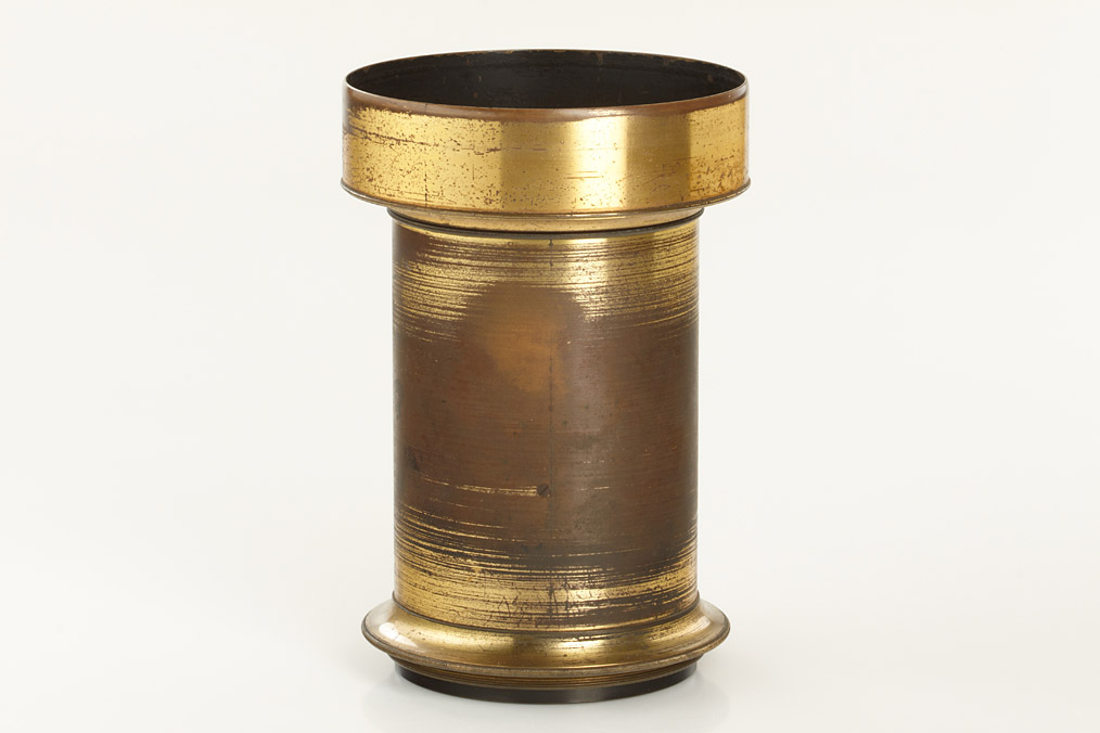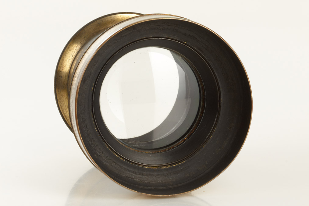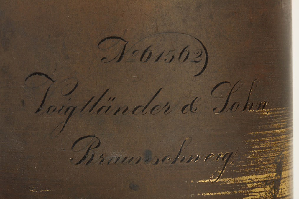 engraved: Voigtländer & Sohn Braunschweig, approx. 40cm focal length, with clean lenses, for waterhouse stops, front and rear lens diameter c.8.5cm, height c.19cm, hood