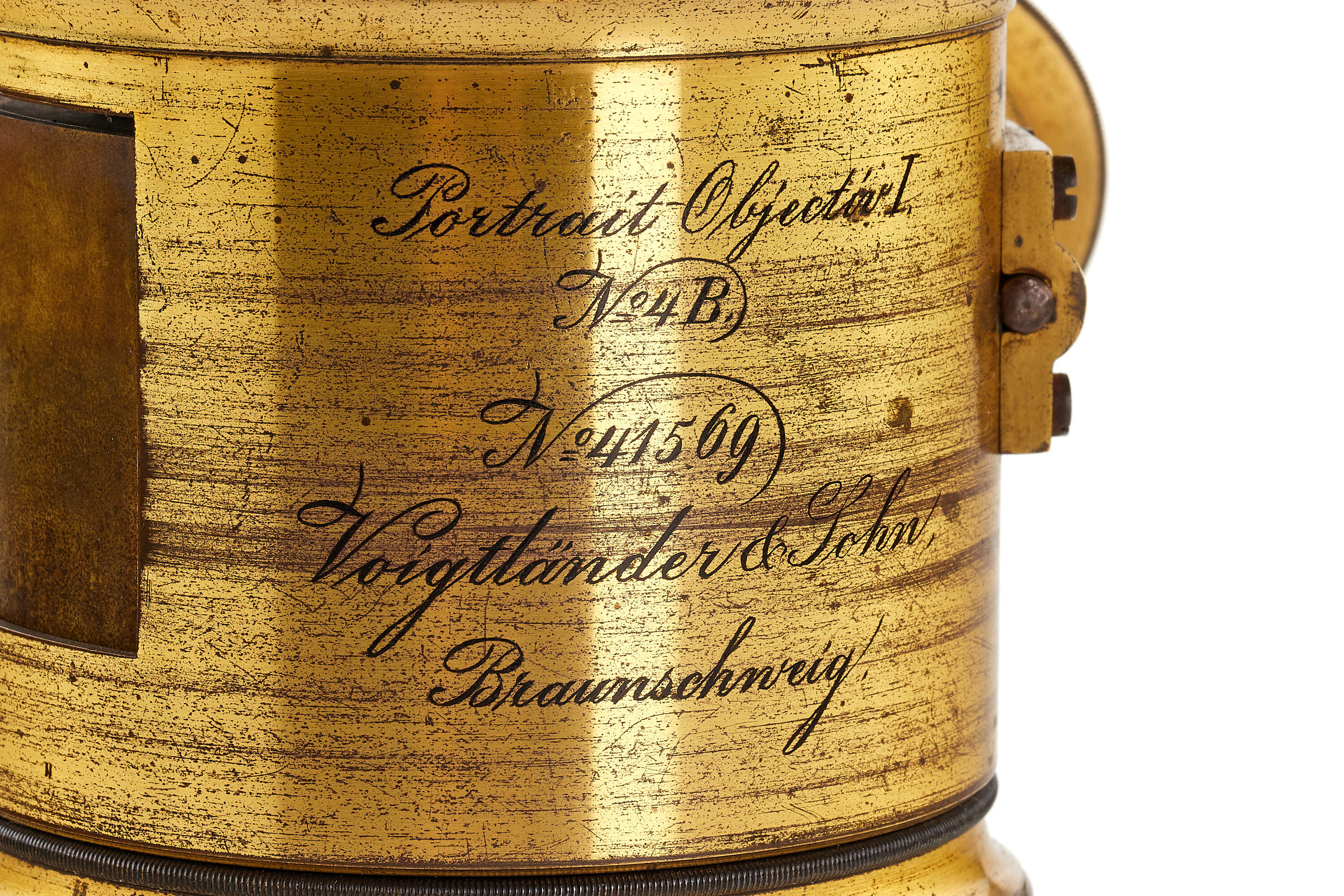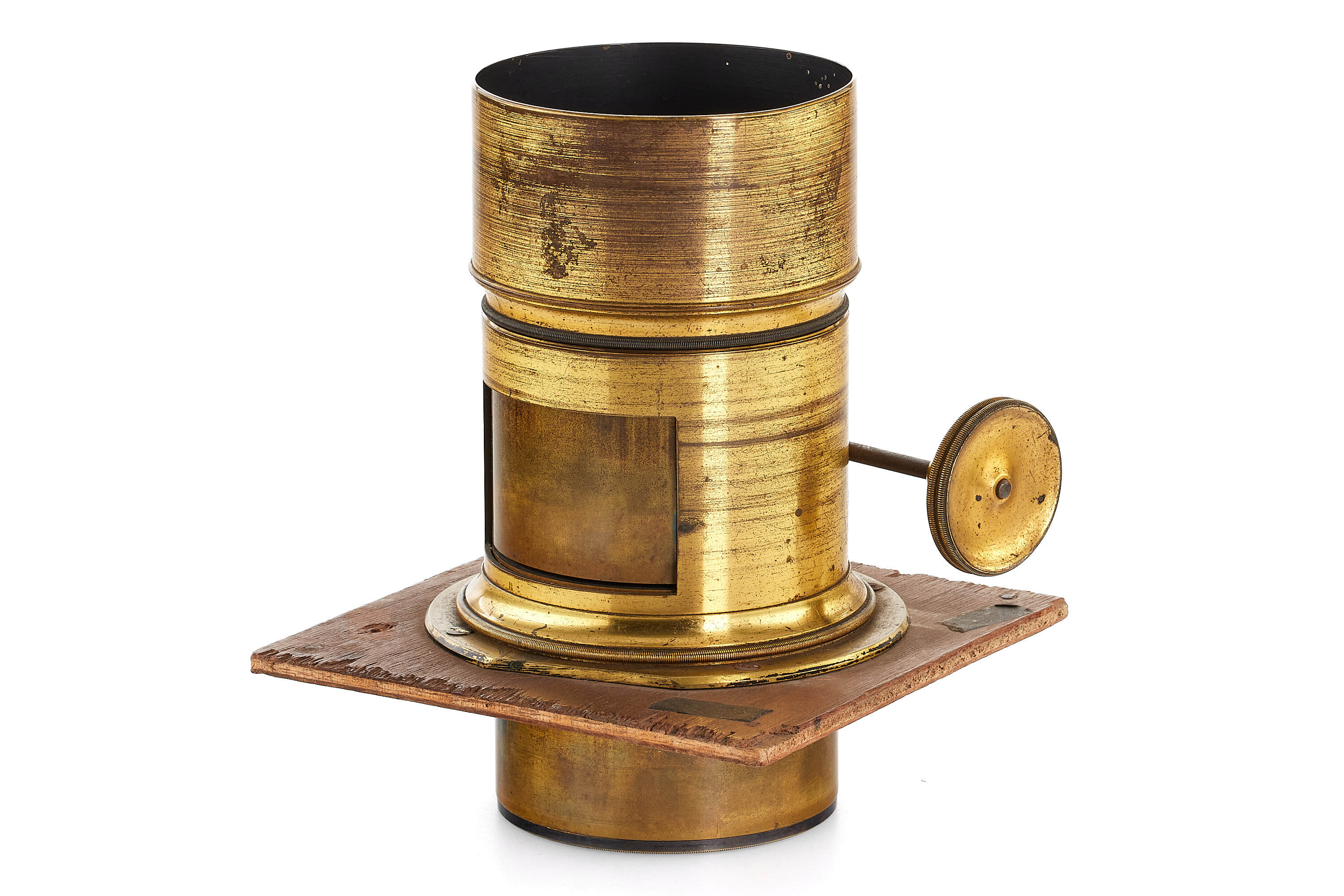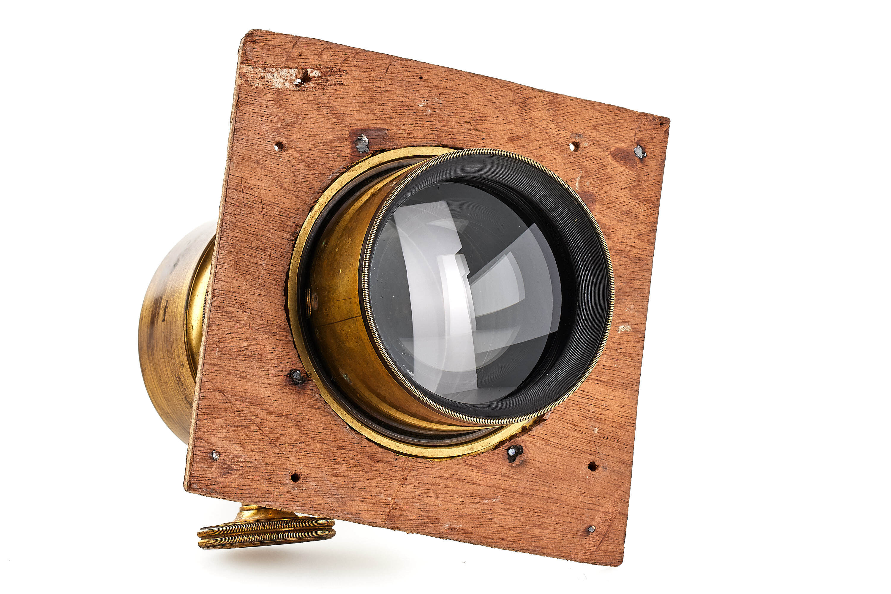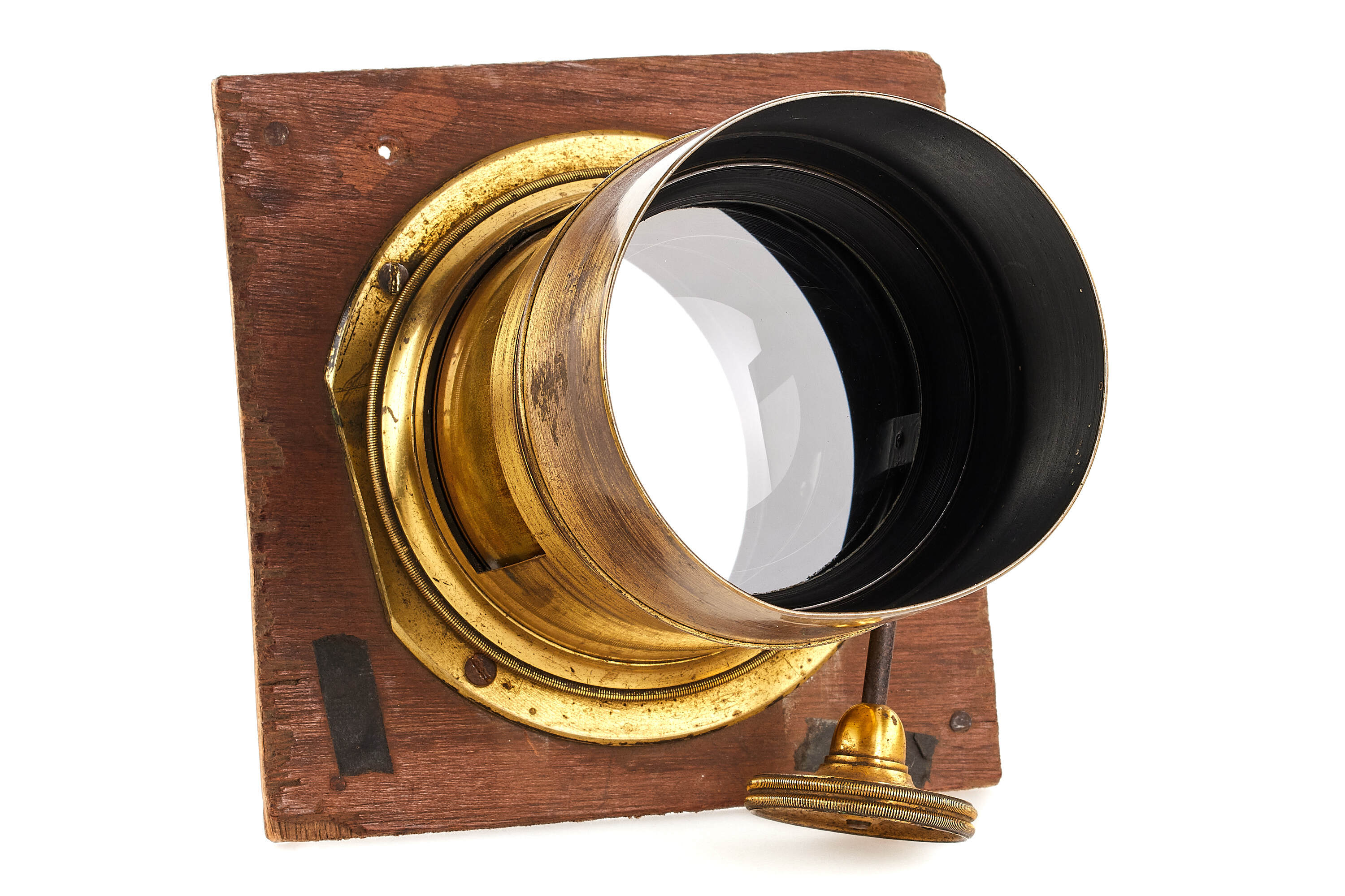 Very early and rare Petzval portrait 20.9cm lens covering up to 12x16cm, in good condition, optics only showing some cleaning marks on the front element, with hood, leather front lens cap and mounting plate (cond. B-).