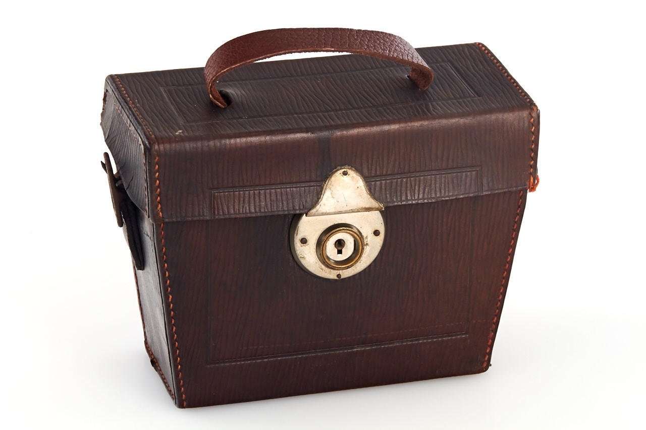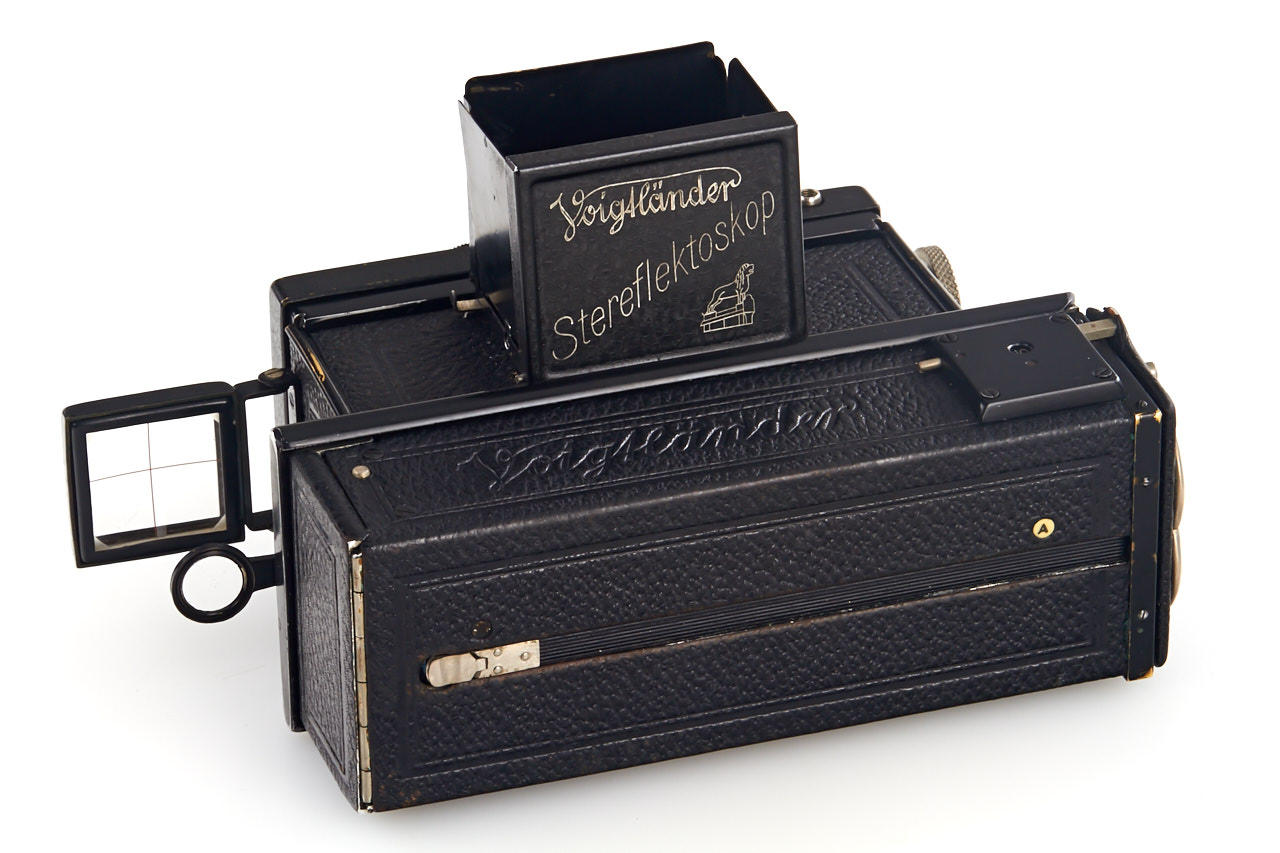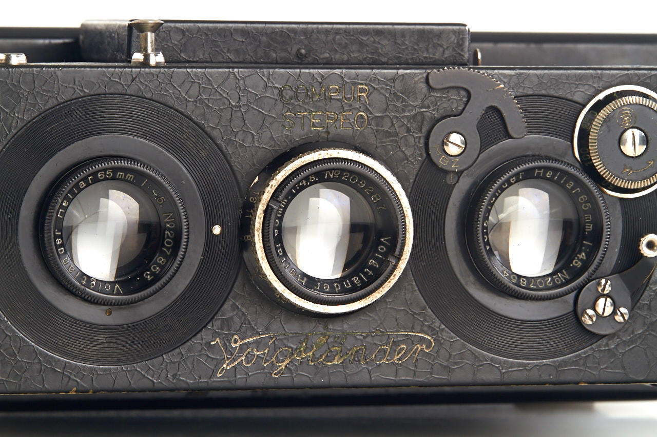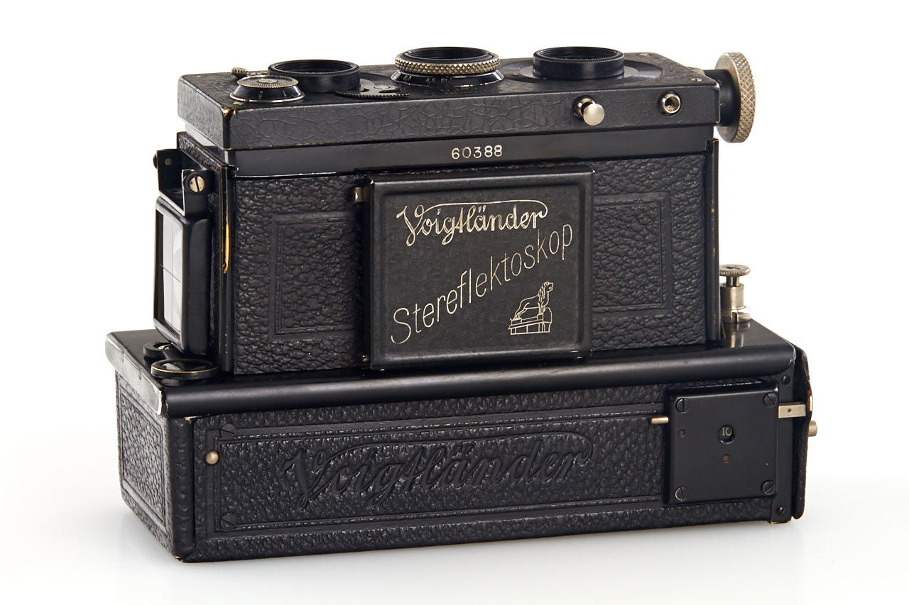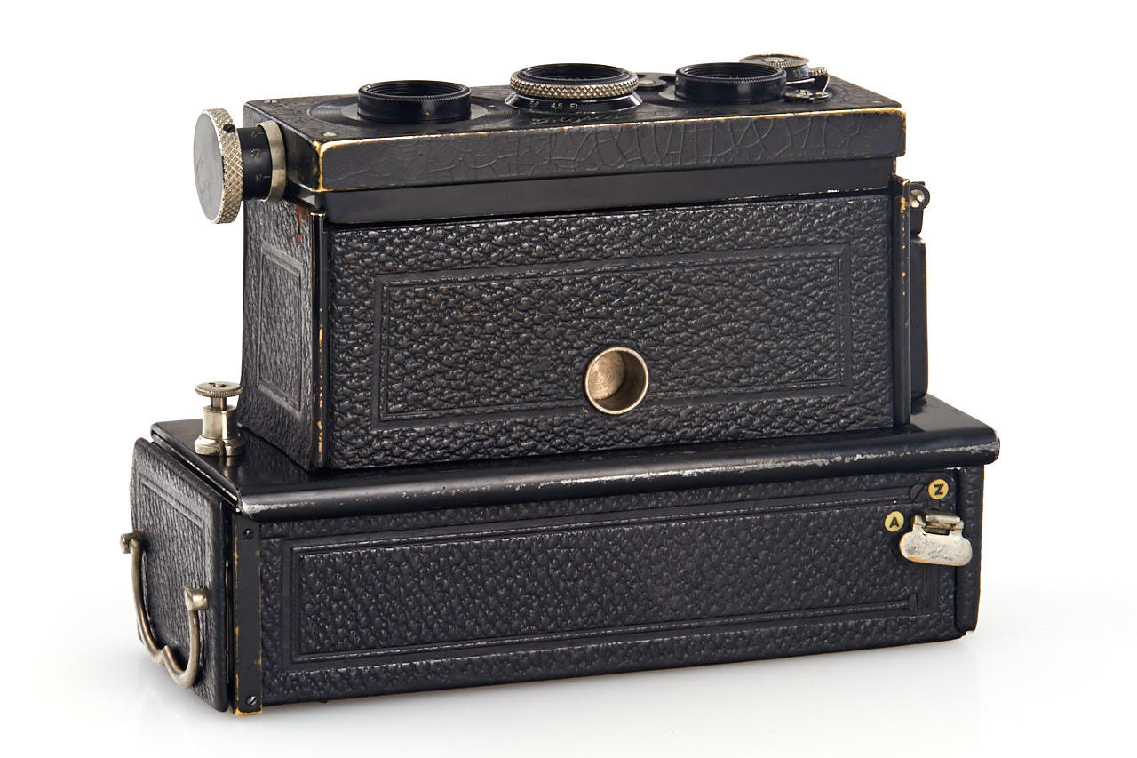 second version in excellent condition, with dual Heliar 4.5/65mm no.207853 and 207854 in Compur Stereo shutter, with matching magazine back and original leather case