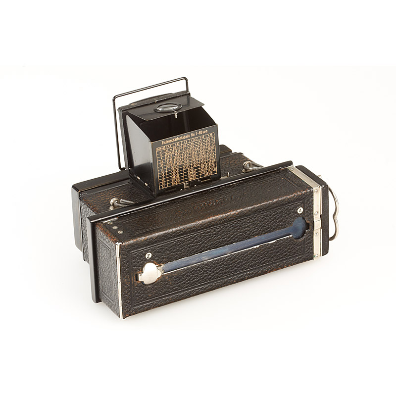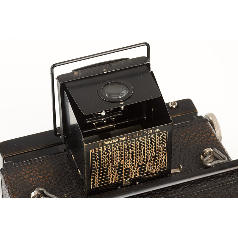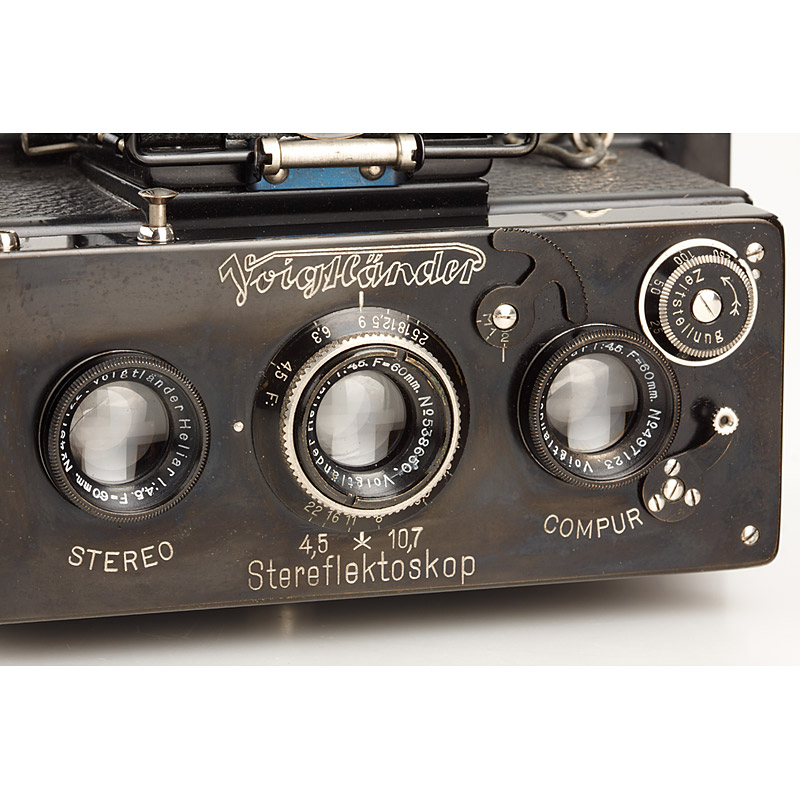 4.5x10.7cm, third type, with a pair of Heliar 4.5/60mm lenses nos.497122/3, Heliar viewing lens no.538650, slow shutter, caps, magazine back, strap, case