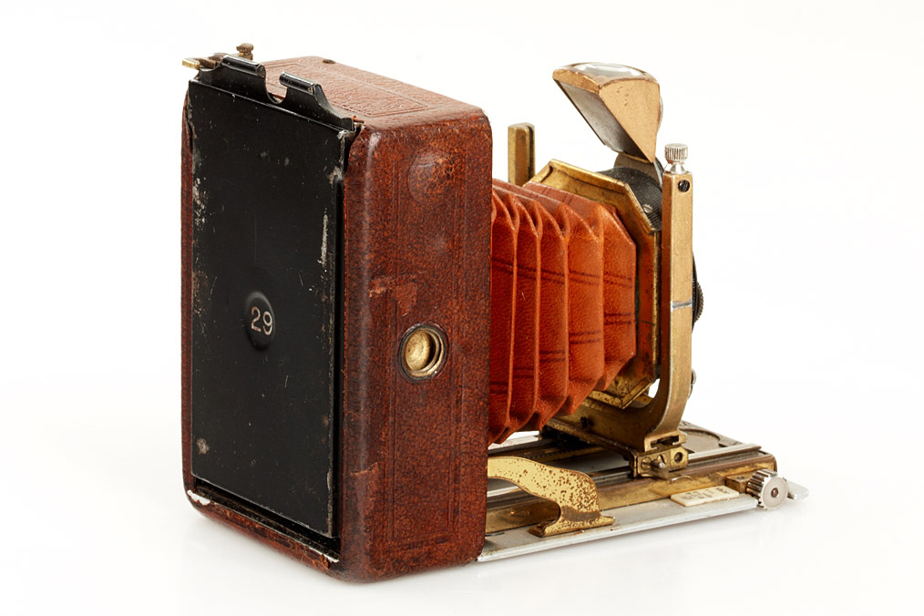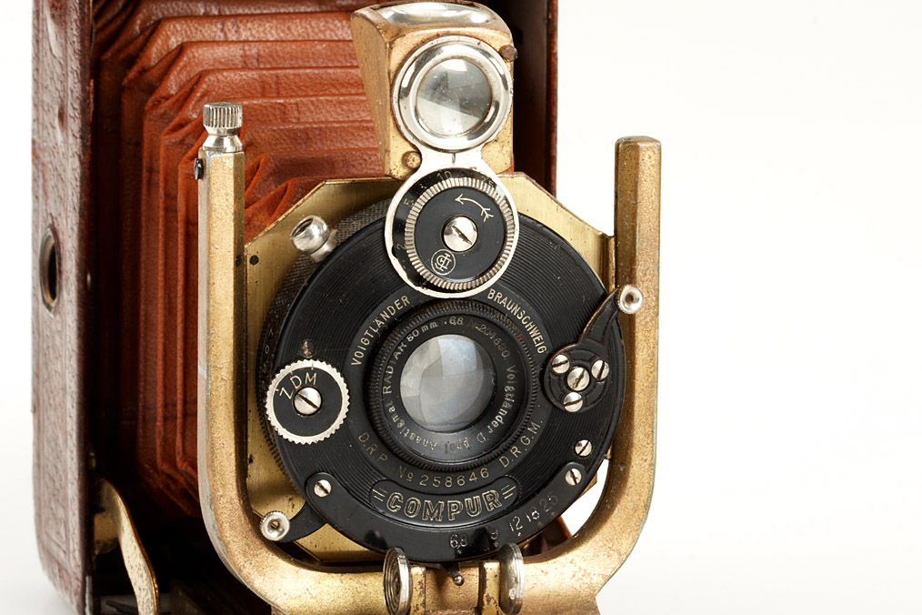4,5x6cm, rare deluxe version, brown leather, brown bellows, gold plated metal parts, Doppel-Anastigmat 6.8/80mm no.204890 in Compur shutter (focusing screen missing, one filmholder), with plaque engraved: PHOTO-PORST NÜRNBERG
