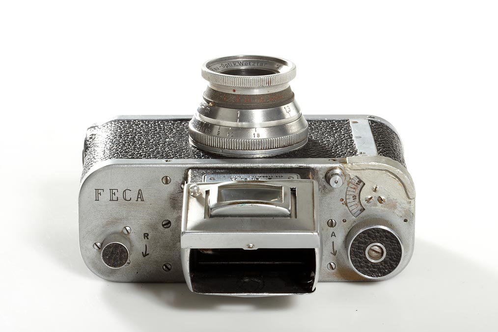 extremely rare, early German post-war SLR camera for 35mm film in working order, Rau Optik Wetzlar Astro-Astan 2.9/4.7cm no.10046, with Exakta finder, some restauration on corner