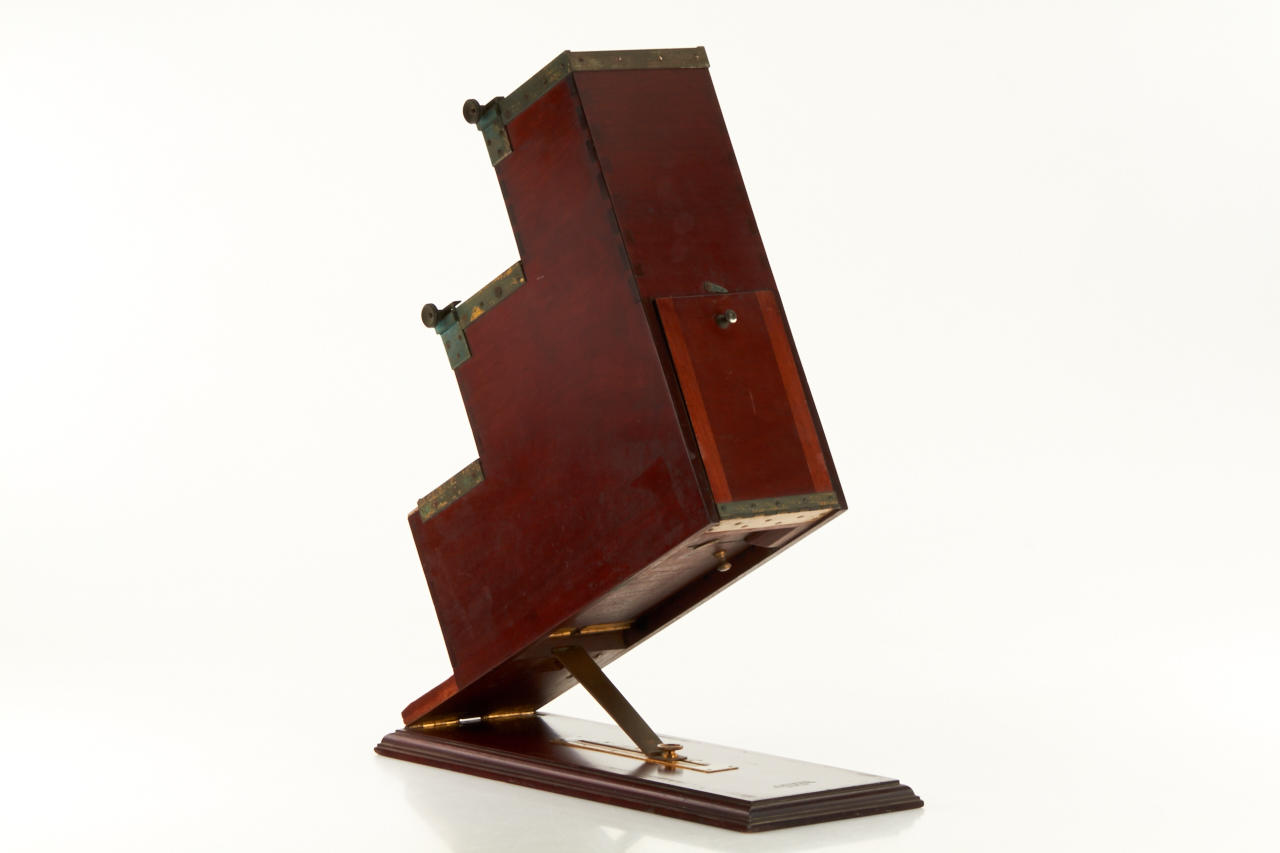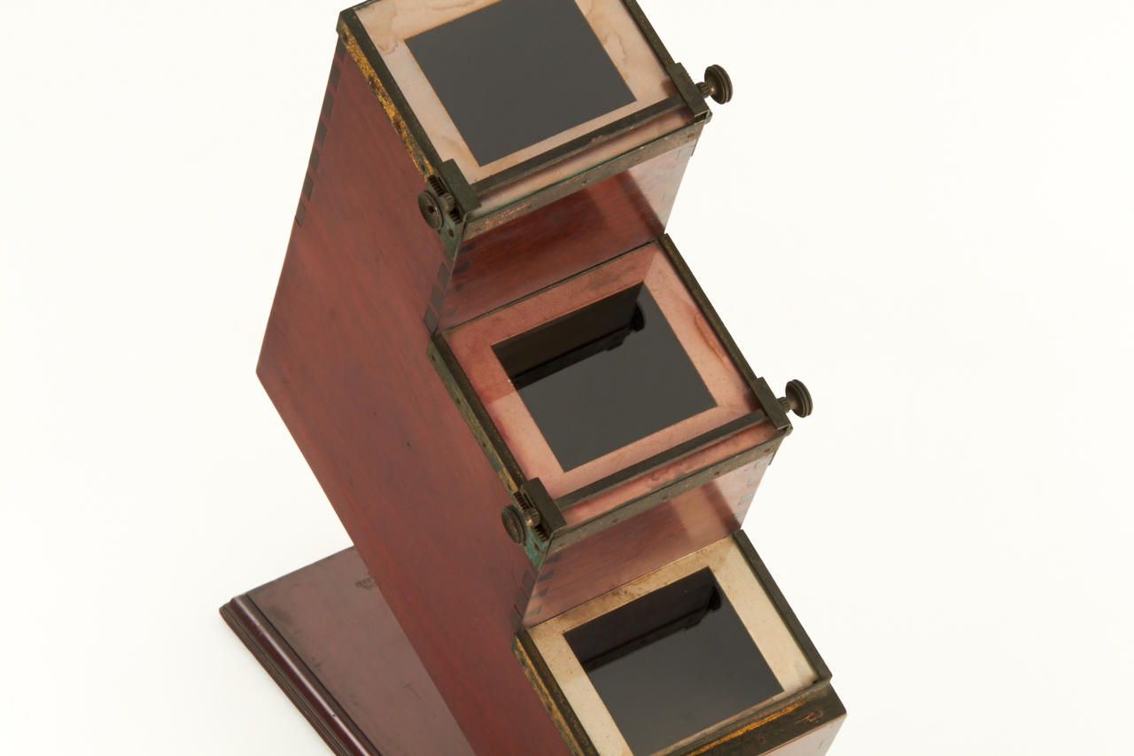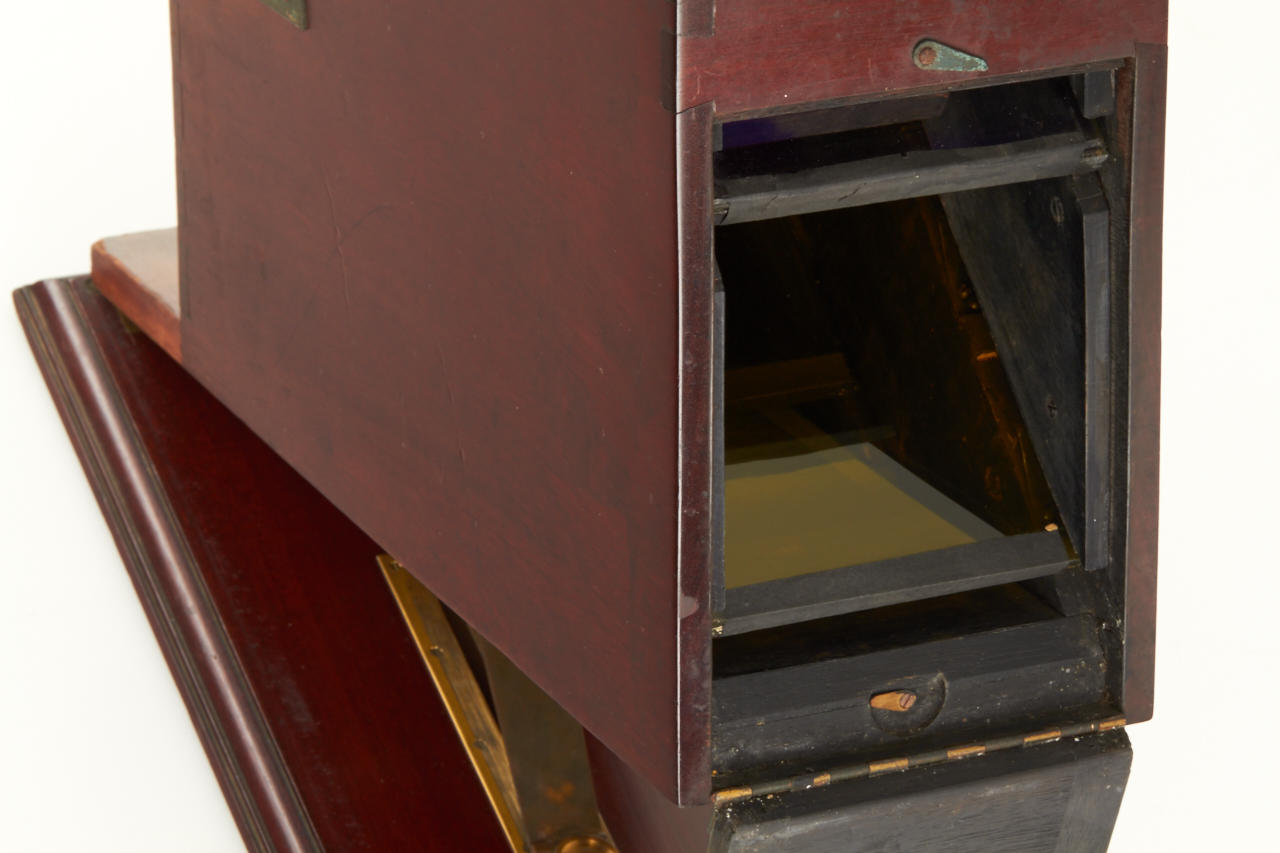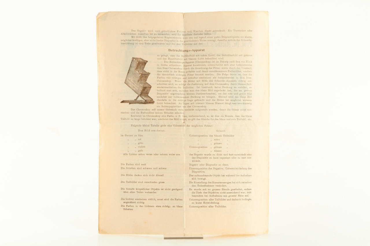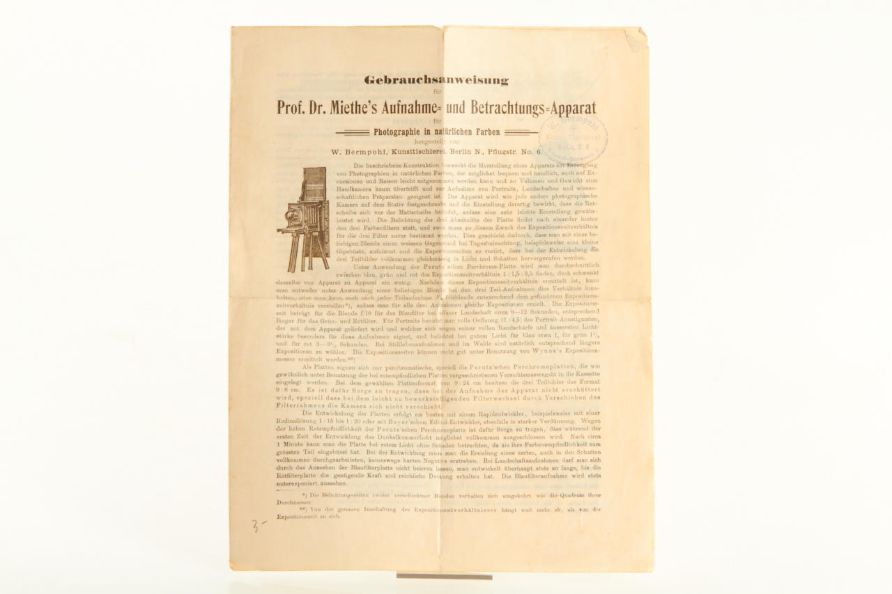 very rare viewer, complete with all filters in absolute original condition, stamped 'W.Bermpohl, Kunsttischlerei Berlin', with the original German manual (4 pages) for the Dr.Miethe camera and viewer