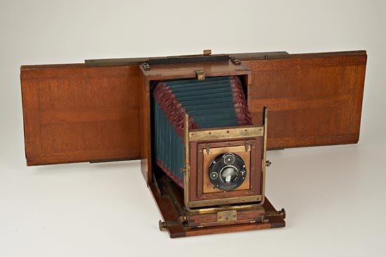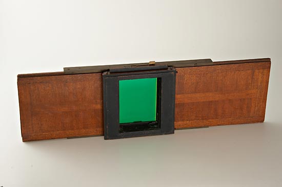 for three 13x18cm colour separations, Berlin, Germany, the folding mahogany body with brass fittings and green cloth bellows, a Rodenstock lens no. 24748 (lacking front element), Rodenstock Eurynar 6.8/18cm lens no.310090 in dial-set Compur shutter, Teleansatz II telephoto attachment, repeating back with red, green, and blue filters, three long book-form plate holders each holding three plates per side, three double plate holders, and extra colour filters. (A rare and early 3-color camera) See: Jahrbuch for Photographie Und Reproduktionstechnik, edited by Dr. Josef Maria Eder, 1902