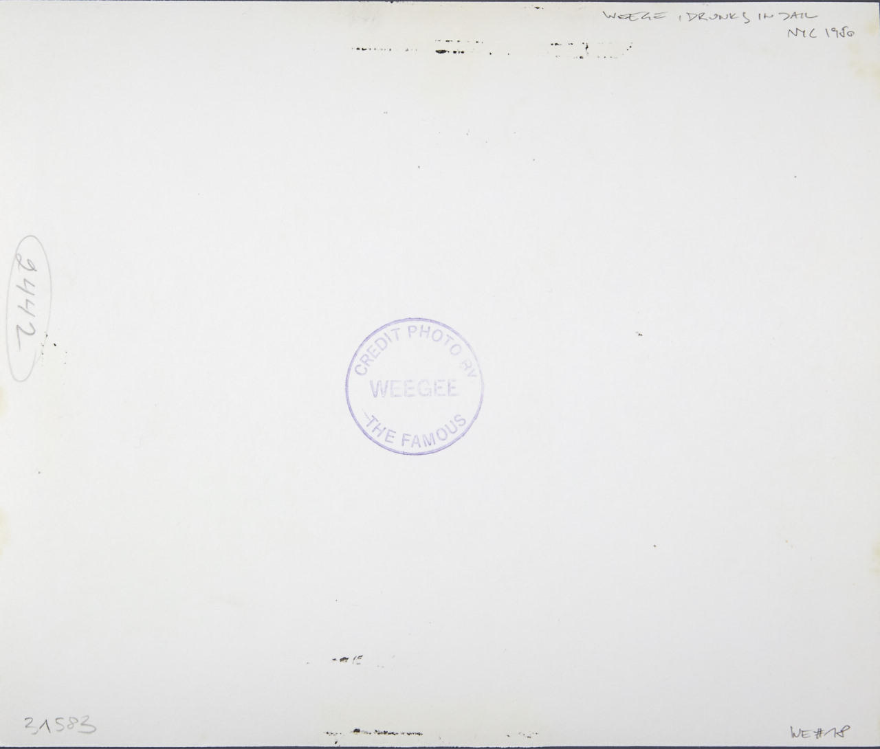 Vintage silver print 15,3 x 18,3 cm Photographer's circular “CREDIT PHOTO BY WEEGEE THE FAMOUS” stamp and numerical notation (most likely by the photographer) in pencil on the reverse