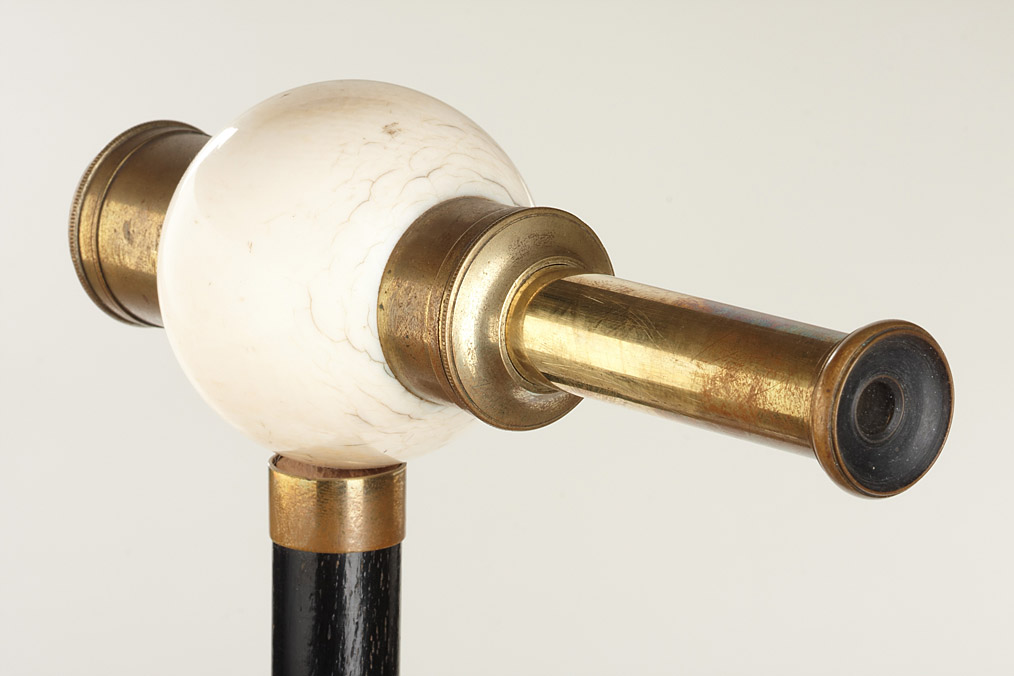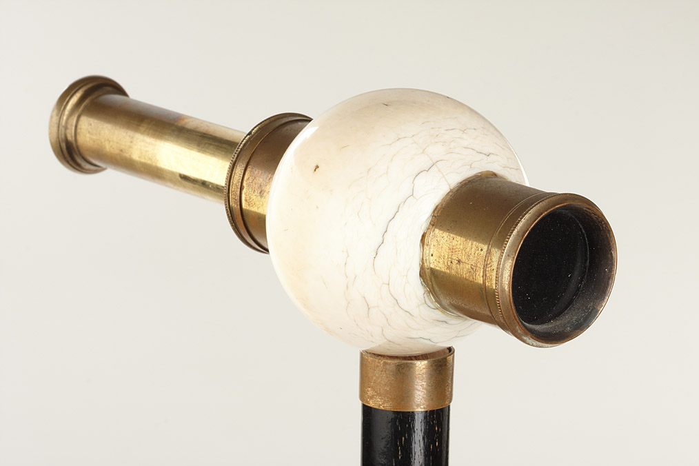 Combination of a walking stick with an integrated spy-glass, the stick is made of black painted wood, at the upper end a turned ball made of bone which is pierced by a telescope. A very beautiful and unusual pieces in good original condition! Length: 94cm.