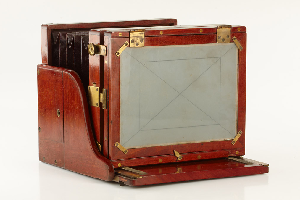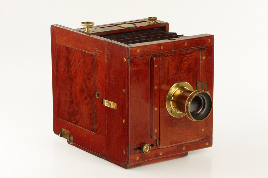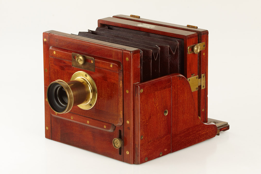 decorative half plate field camera with red leather bellows, well crafted mahogany body with brass fittings, the brass lens engraved: A. BANZ RAPID RECTILINEAR NO.10909, maker's label made of bone on the right side, cap, two double film holders, in wooden case