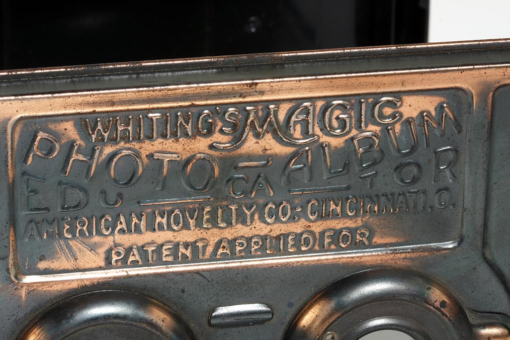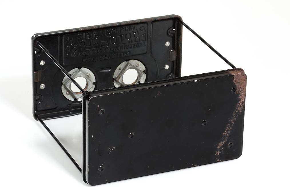 interesting stamped-metal viewer in black and copper finish, type and maker's label embossed on the front: 'Whiting's Magic Photo Album Educator', collapses to a flat package and accepts standard size view cards. The lenses rotate to convert the viewer for viewing single prints. A highly collectable stereoscope in perfect condition.