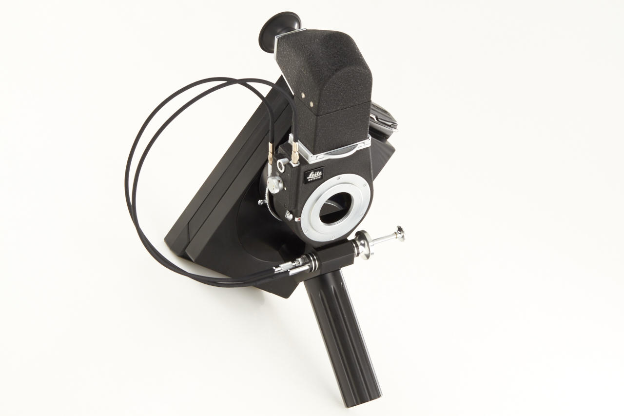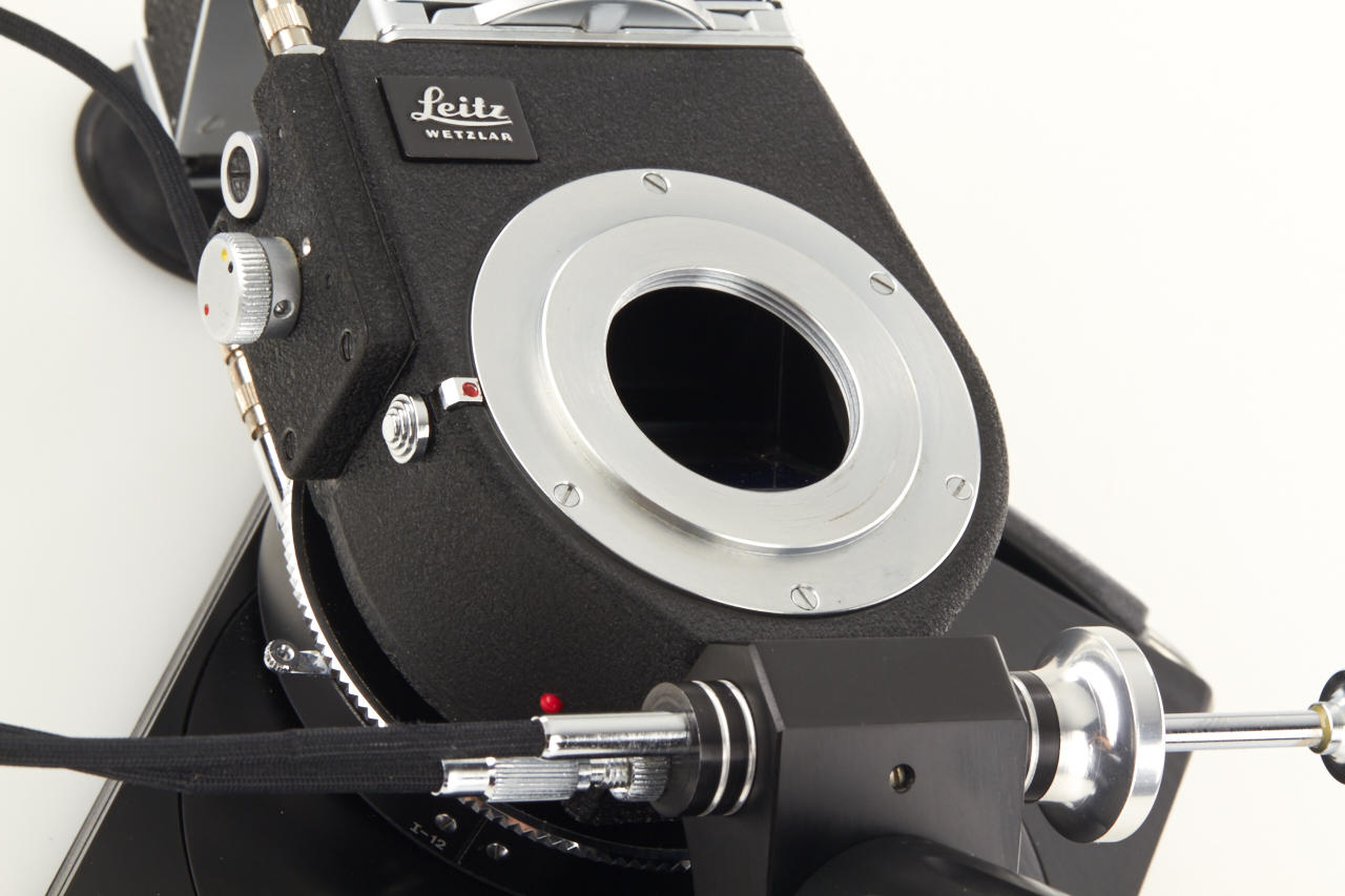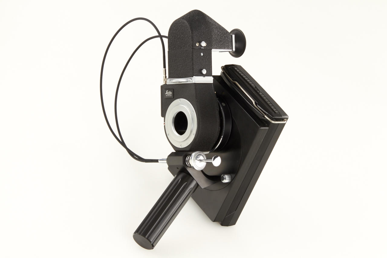 later version of rare custom made to order Micro-Visoflex III outfit including Micro-Visoflex III with ground glass, modified 16499 magnifier with higher housing, removable grip, two lens adapters, Polaroid back, everything in black, leather-covered fitted wooden case