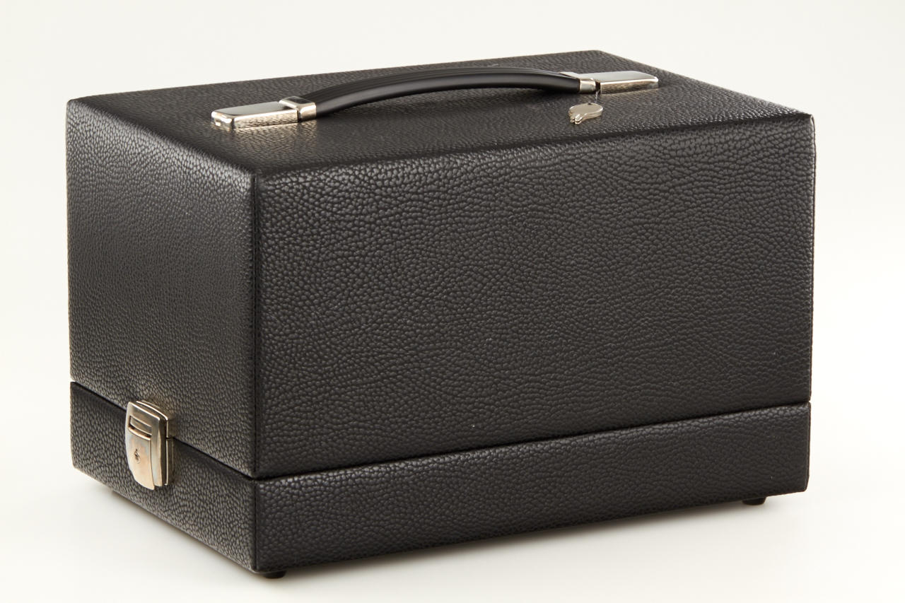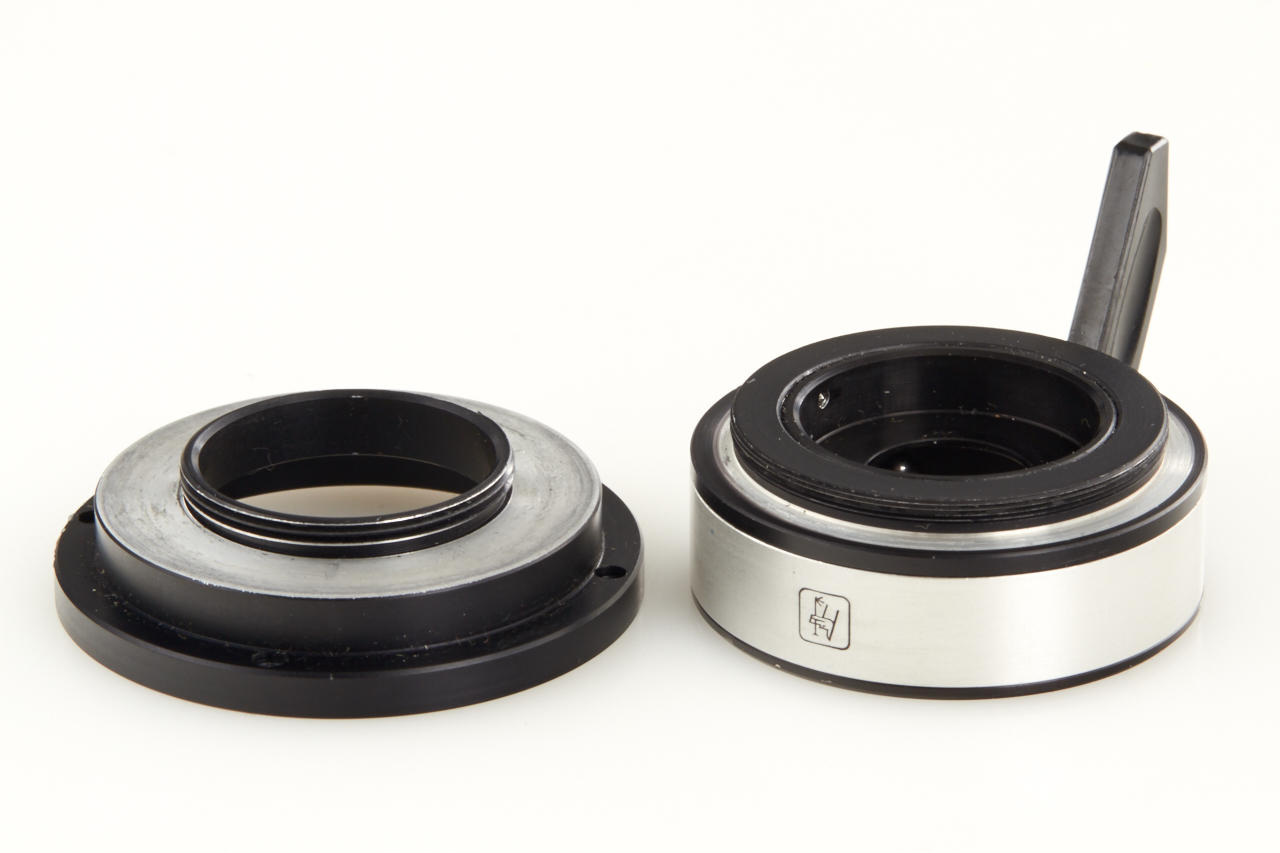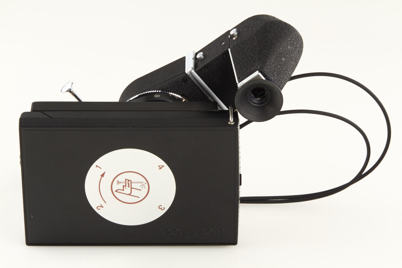 later version of rare custom made to order Micro-Visoflex III outfit including Micro-Visoflex III with ground glass, modified 16499 magnifier with higher housing, removable grip, two lens adapters, Polaroid back, everything in black, leather-covered fitted wooden case