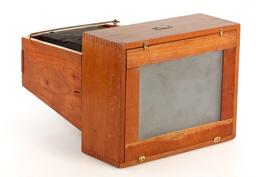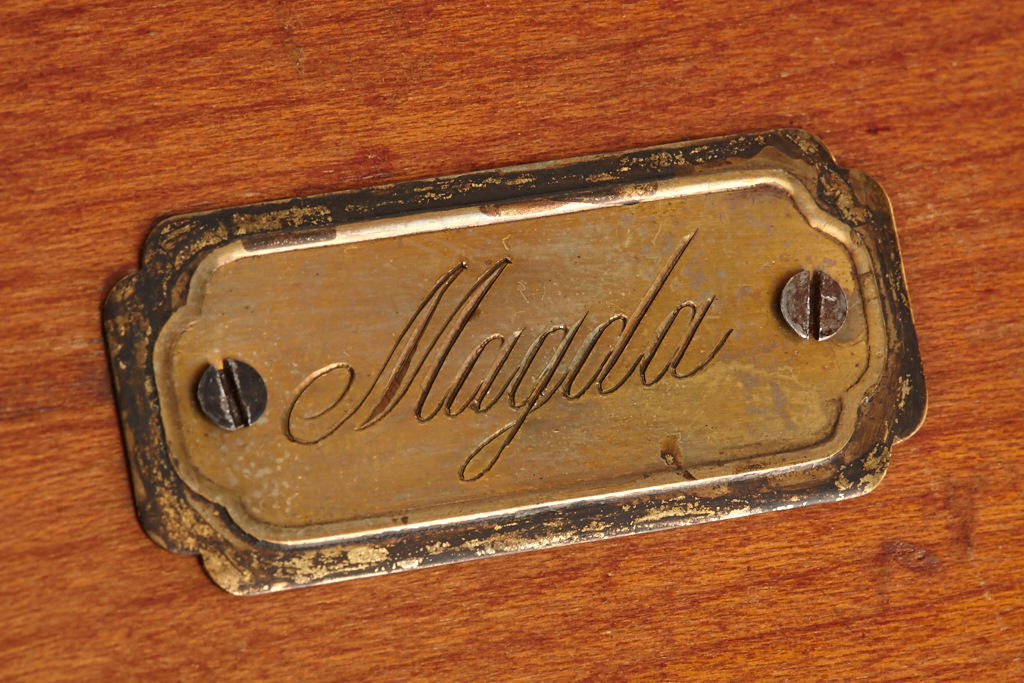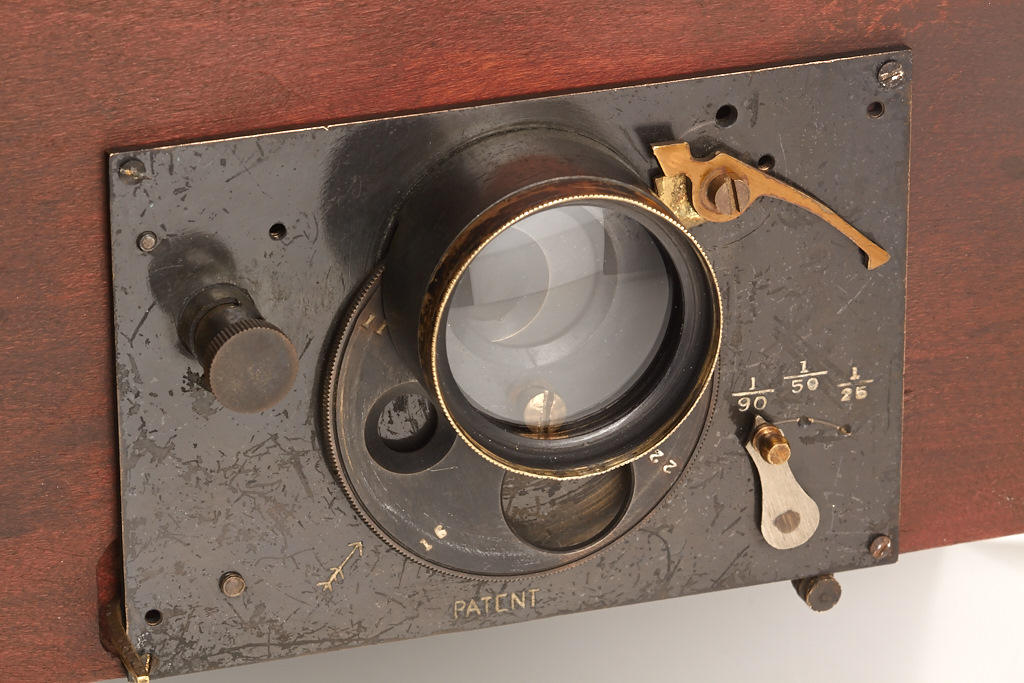 13x18cm, similar to the famous 'Scènographe', unengraved brass meniscus lens with rotary aperture disc in 3-speed shutter, 'Magda' engraved on small plate