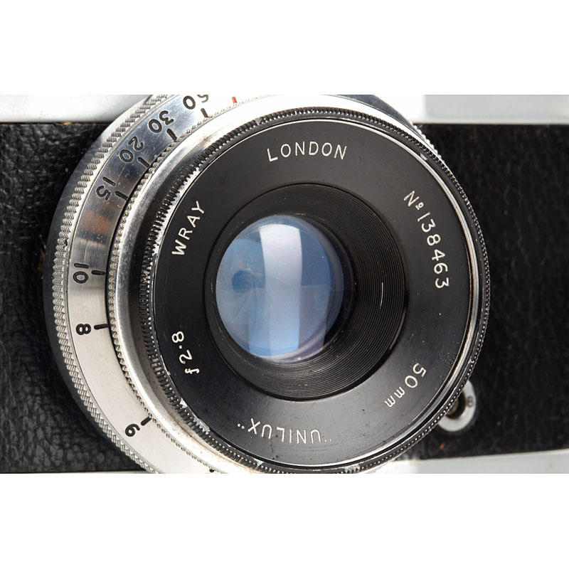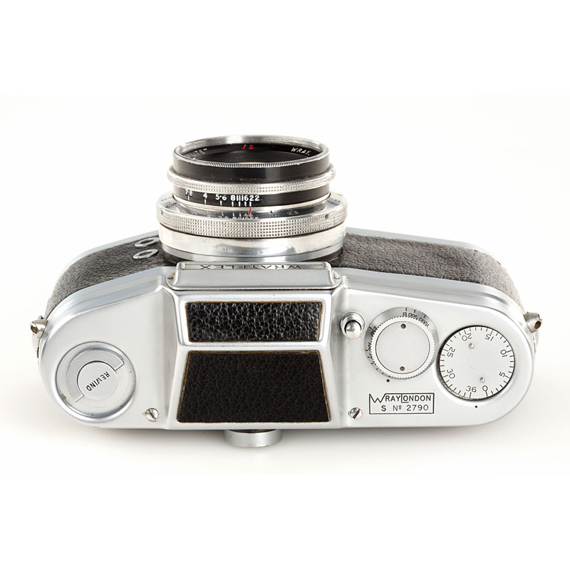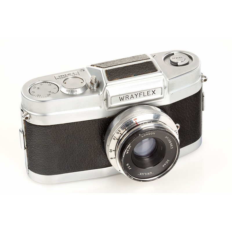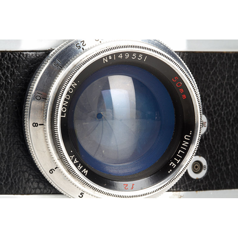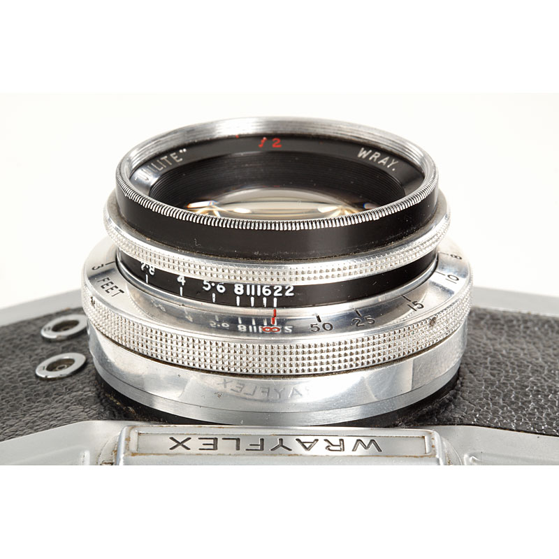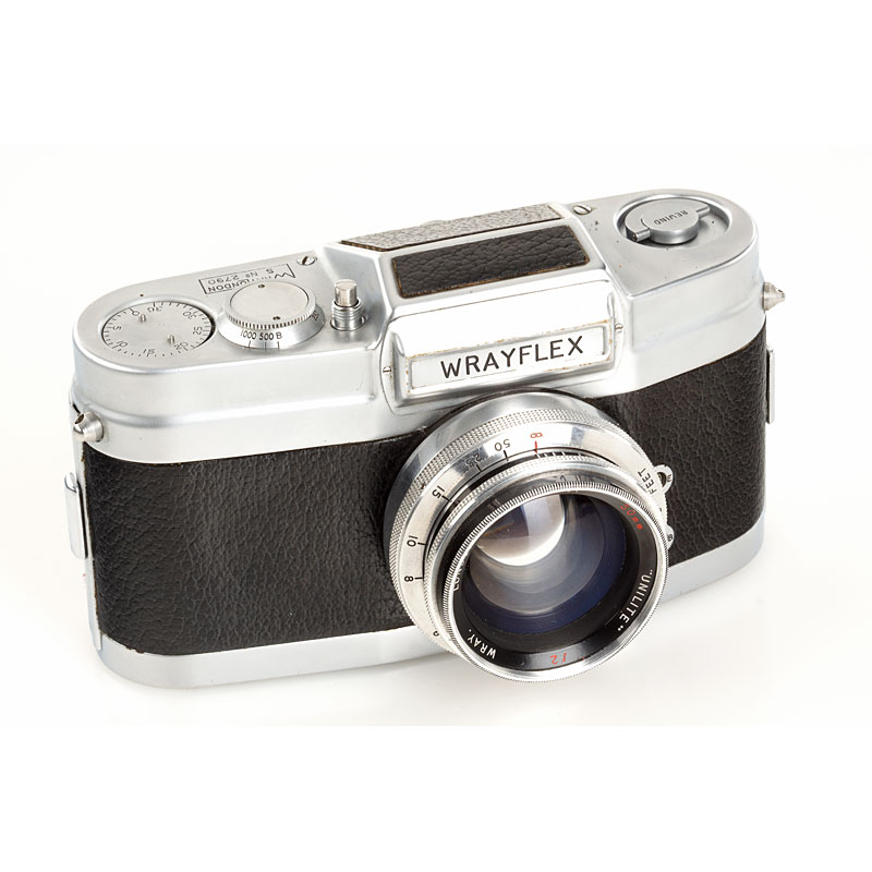 fine outfit in nice condition with two bodies and four lenses: Wrayflex Ia no.2486 (shutter needs attention) with Unilux 2.8/50mm no.138463 (cap, case), Wrayflex Ia no.2790 with fast Unilite 2/50mm no.149551 (cap, case), Lustrar 3.5/35mm no.117062 (cap, case, hood), Lustrar 4/90mm no.181496 (hood, case) , instruction book