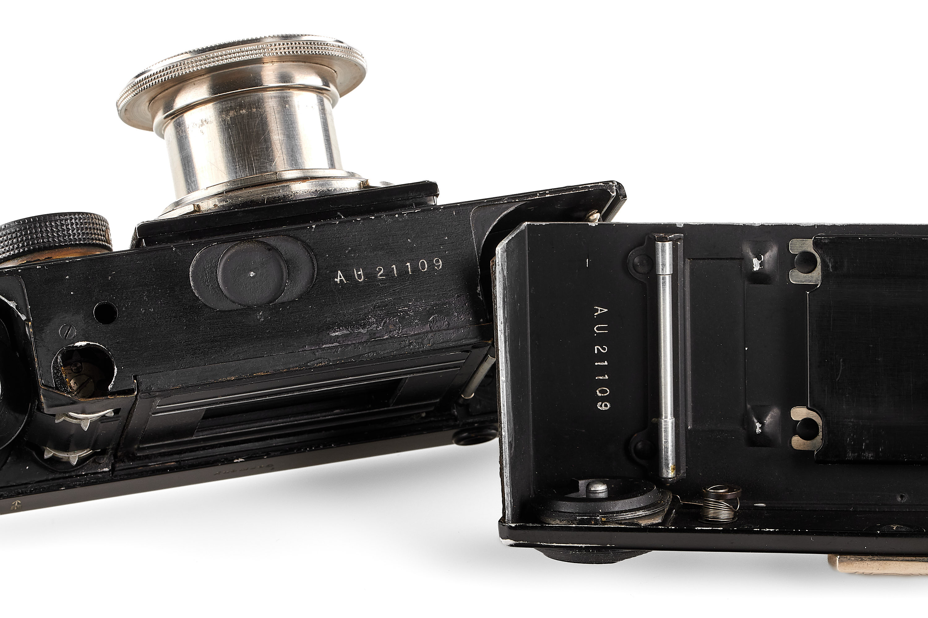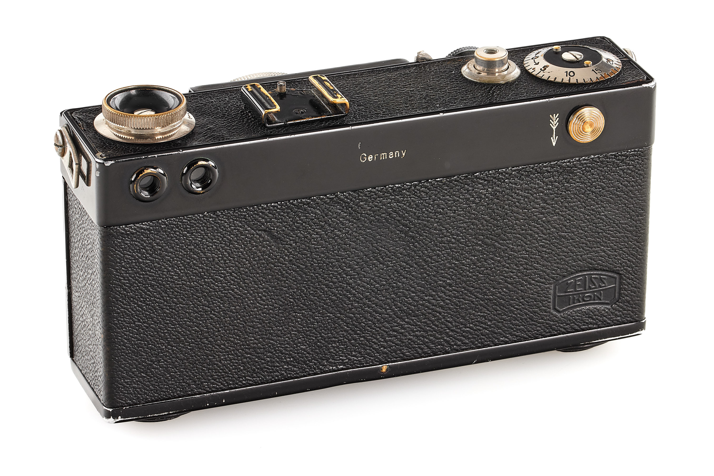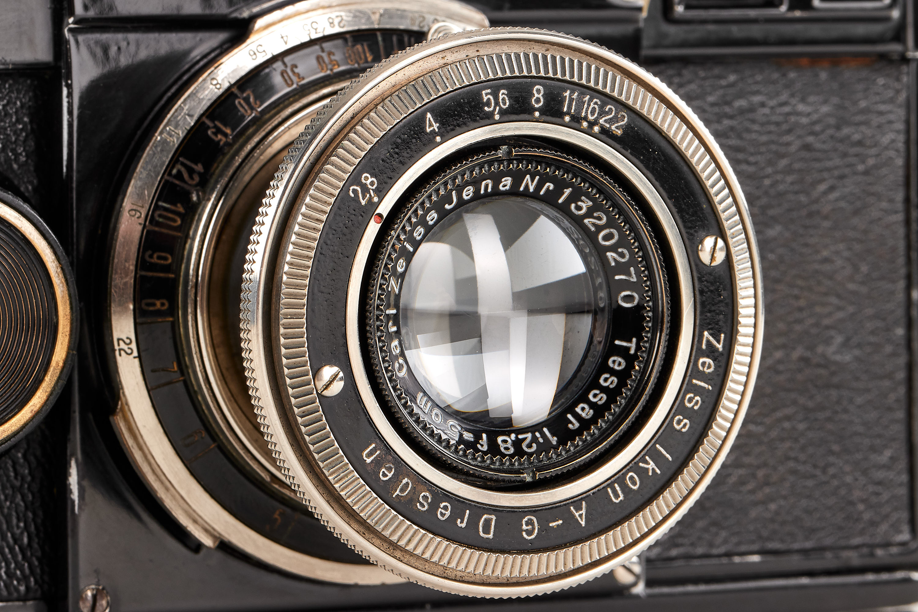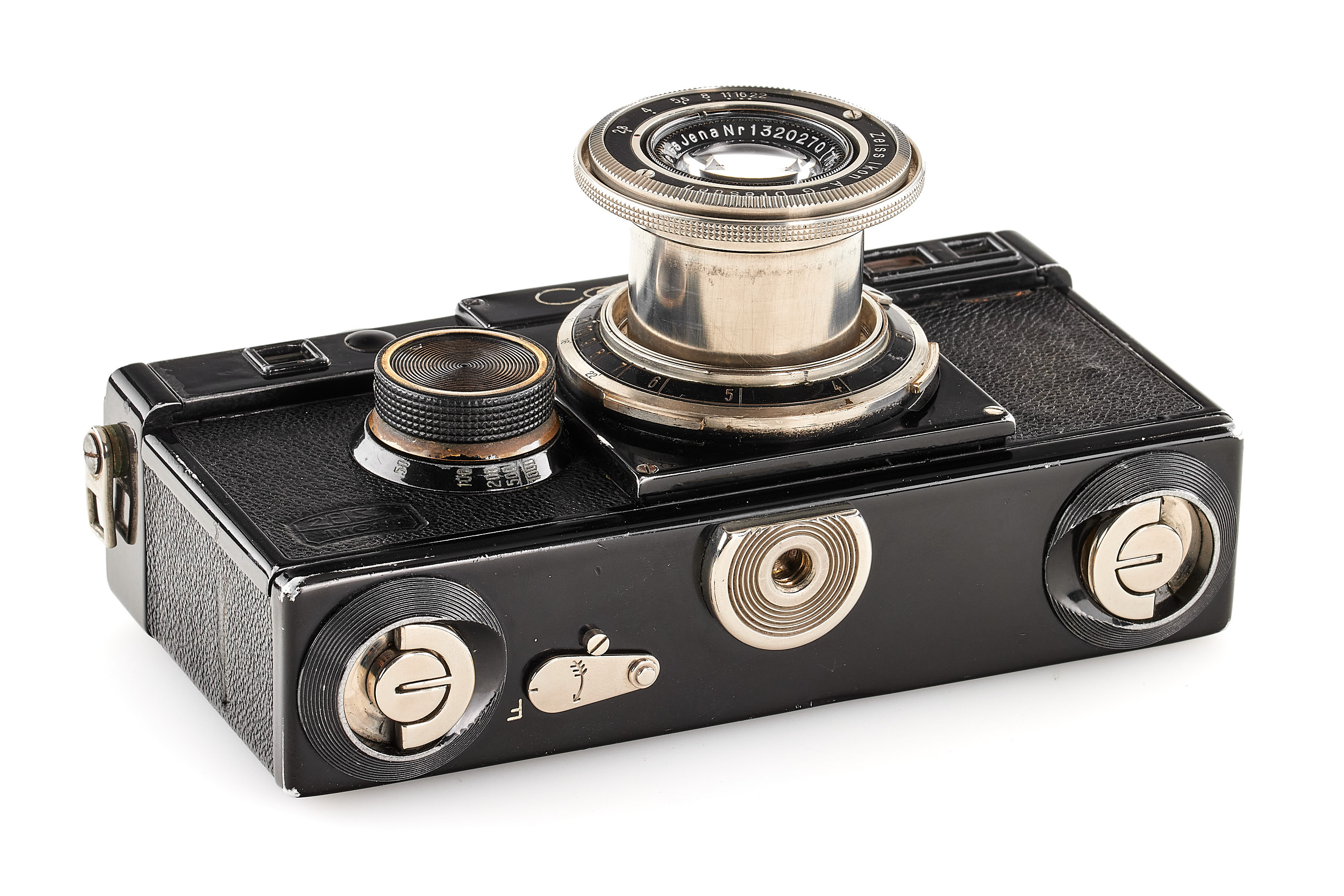 Early second version camera with one 'dimple', export version with 'Germany' engraving and feet scale, matching serial number on the back, in good condition, the shutter reacts but is not accurate, together with a very early and matching nickel Tessar 2.8/5cm no.1320270 from the second official batch (13.10.1931) with clean and clear optics.