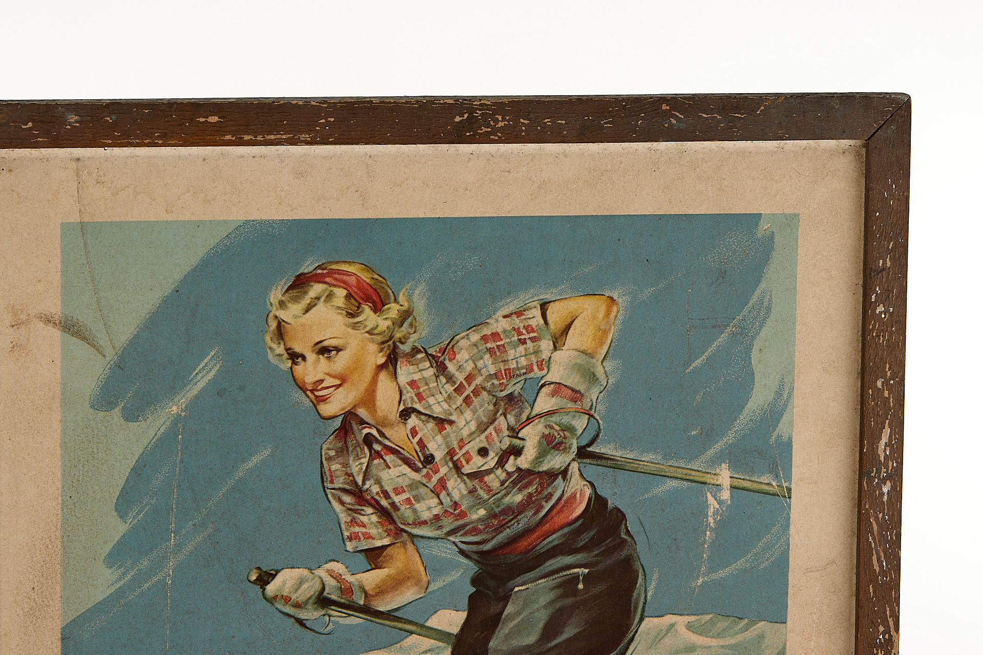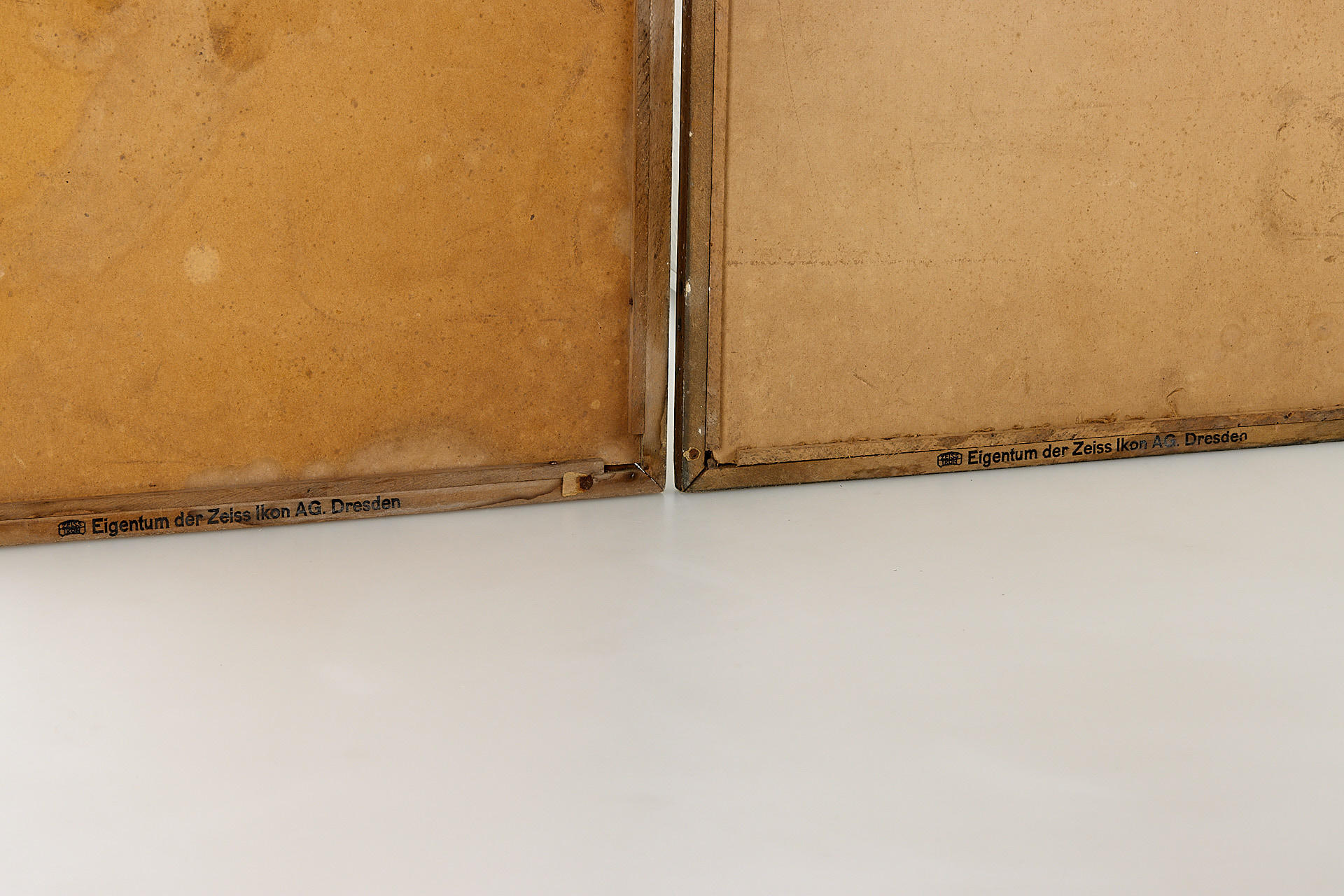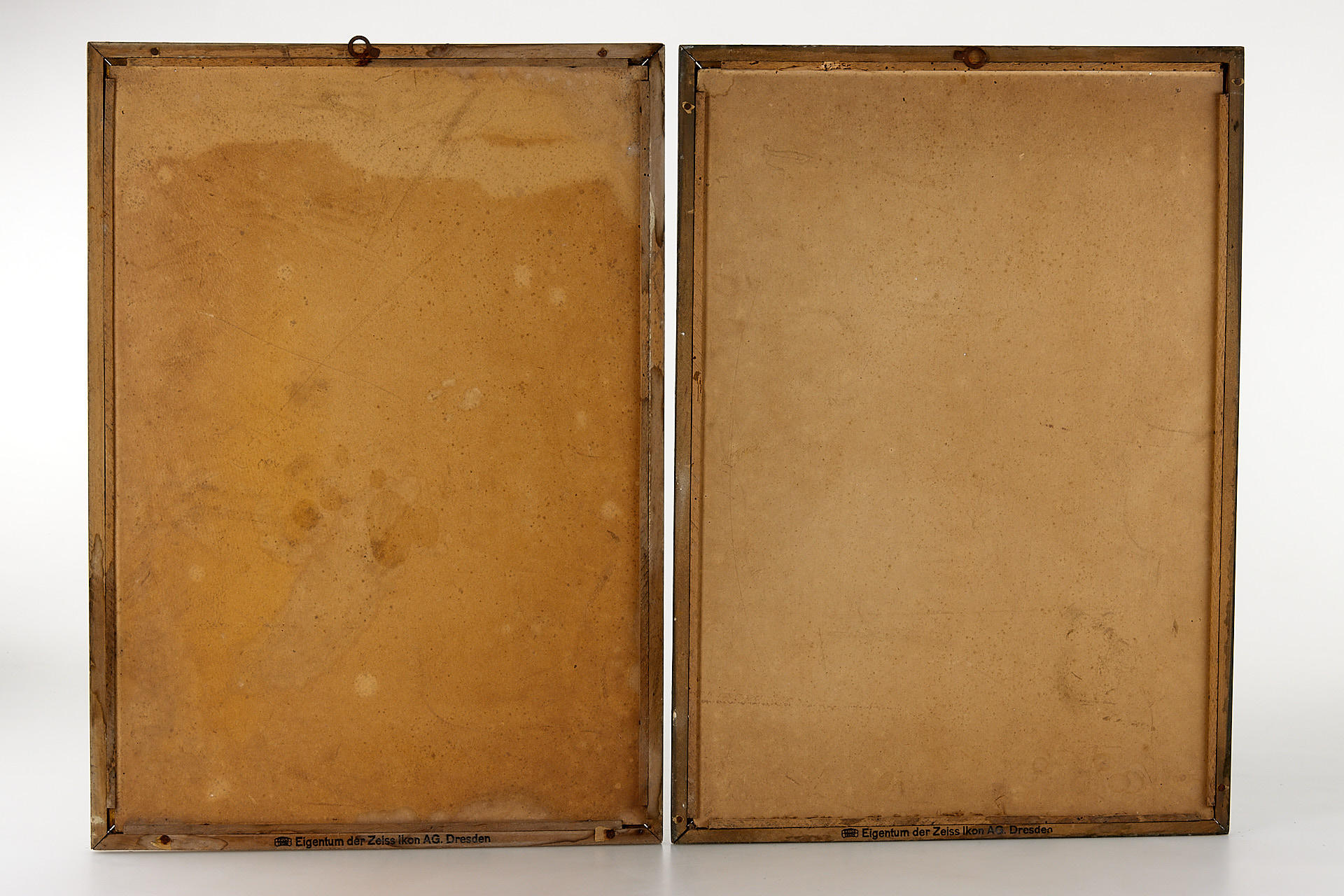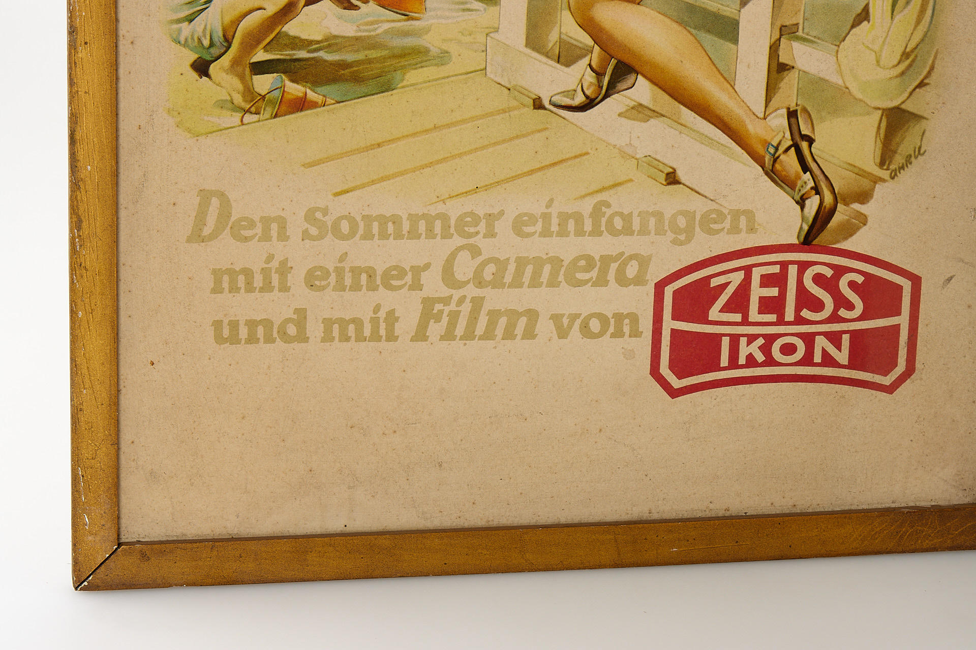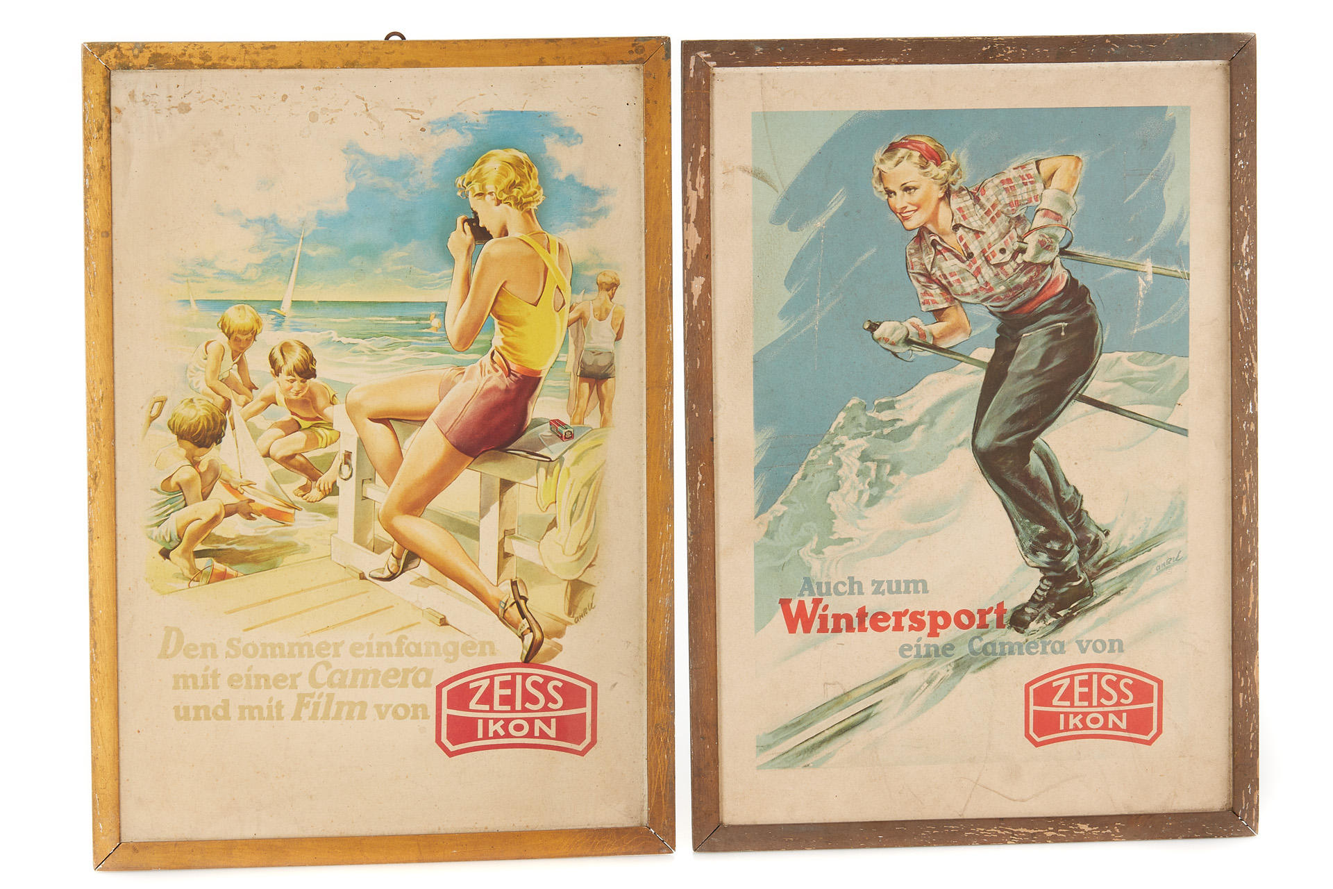 Set of 2 framed advertising prints (36x50cm) for winter and summer, in good condition, stamped 'Eigentum der Zeiss Ikon AG. Dresden' (Property of the Zeiss Ikon AG. Dresden) on the back