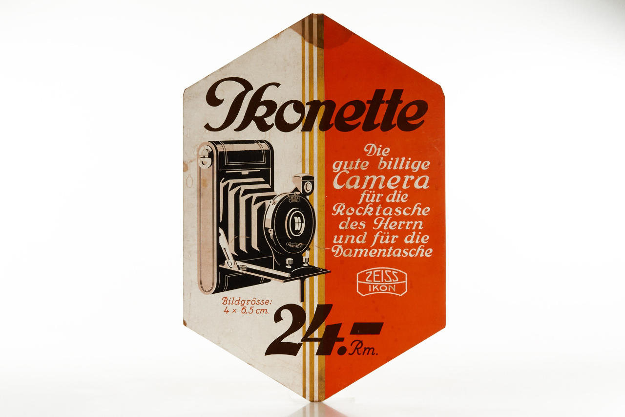 three original Zeiss Ikon advertisements: (1) Kolibri cardboard display stand, c.21x30cm, (2) attractive hanging advertisement showing various folding cameras, 4 elements, each 22cm in diameter, (3) Ikonette cardboard advertisement (size 44x64cm)