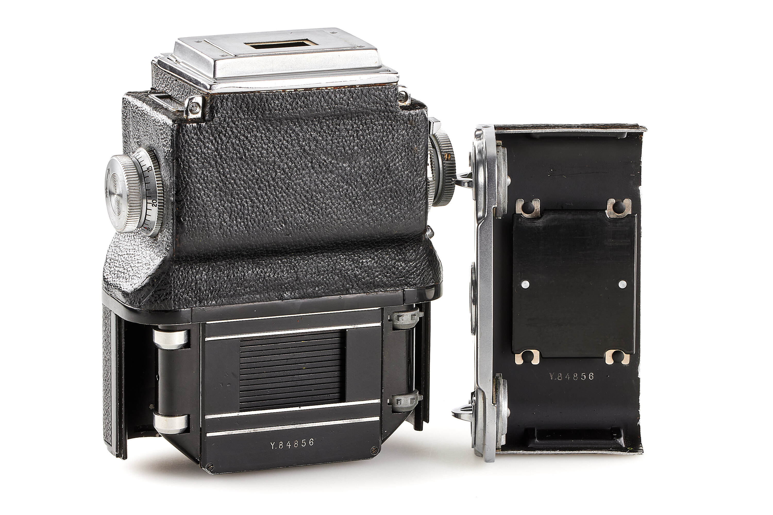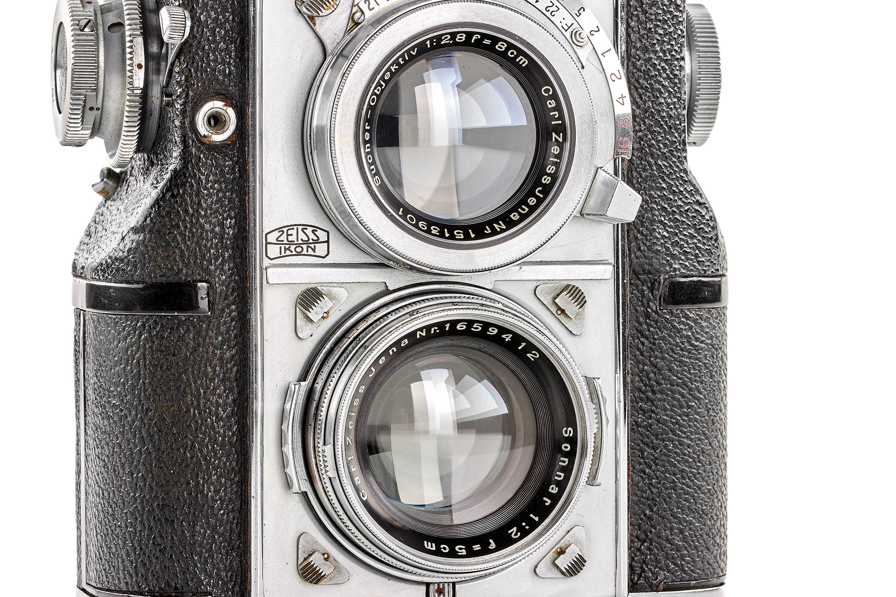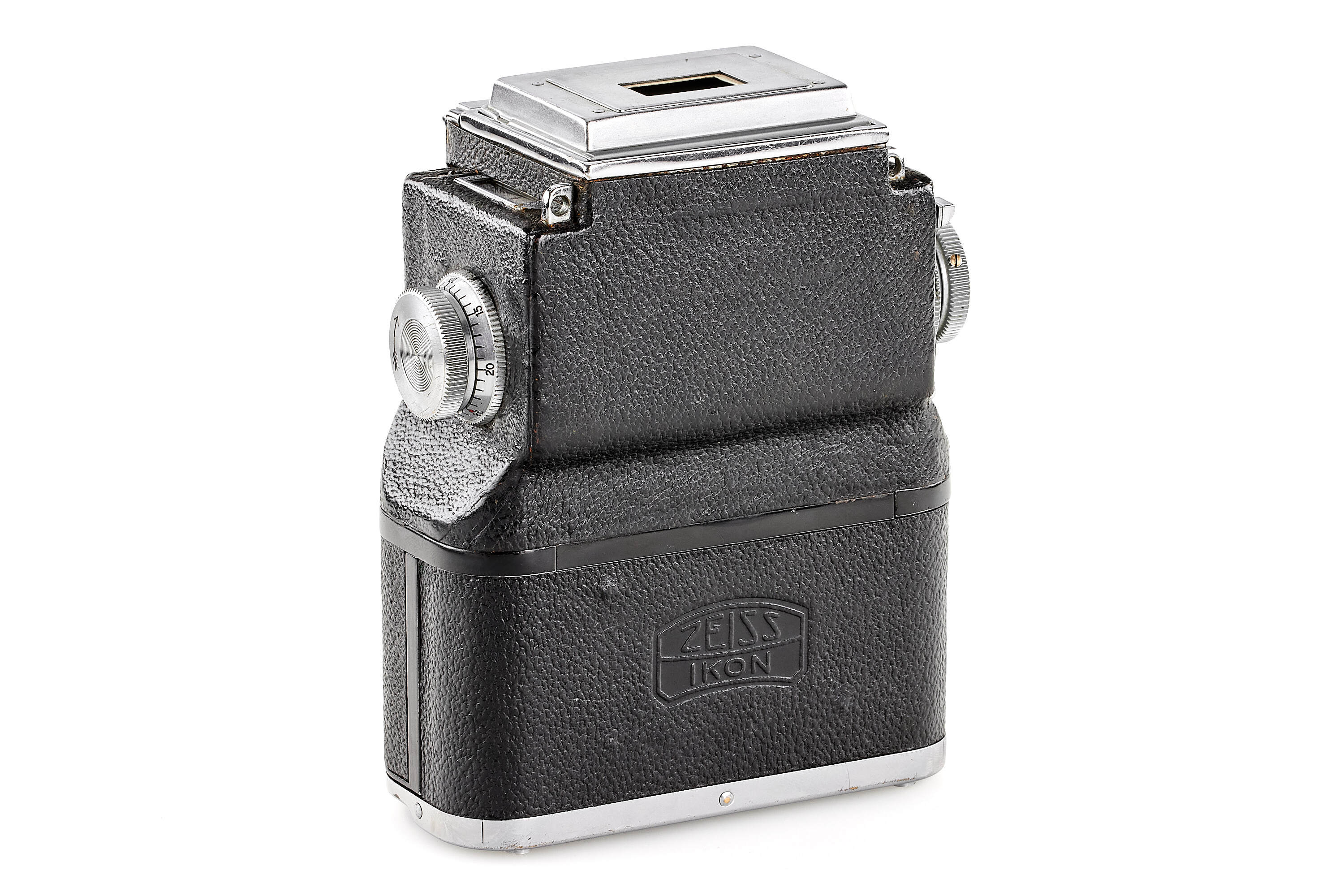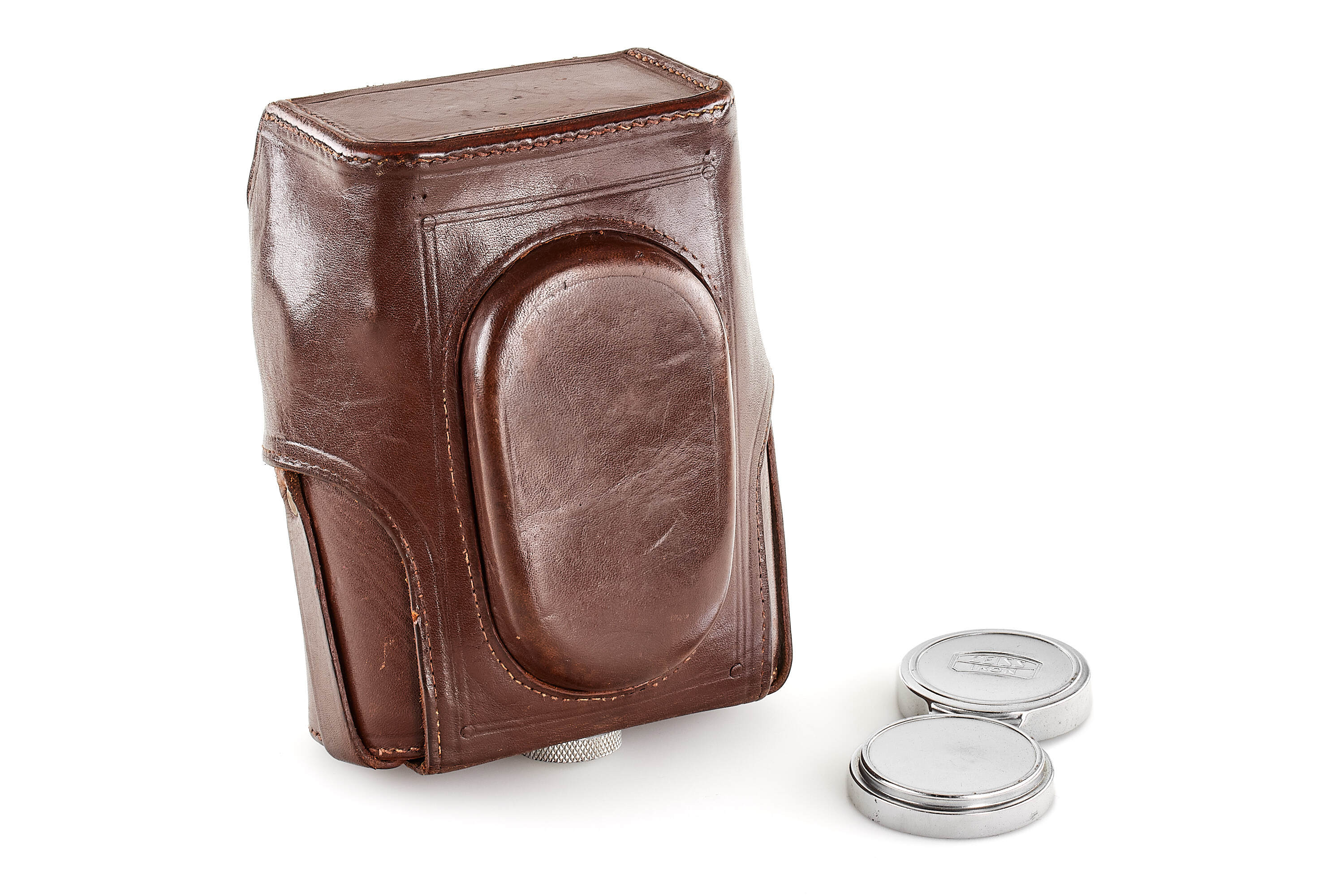 Beautiful classic 35mm TLR camera in almost mint condition, light meter reacting but not accurate, later version with Zeiss Ikon logo on front, with Sonnar 2/5cm no.1659412, optics showing cleaning marks on the front element, finder lens 2.8/8cm no.1513901, with matching back, lenses cap and leather case.