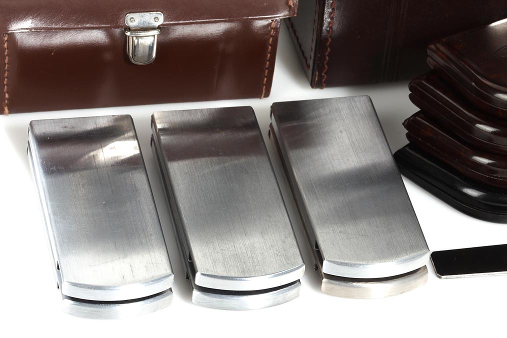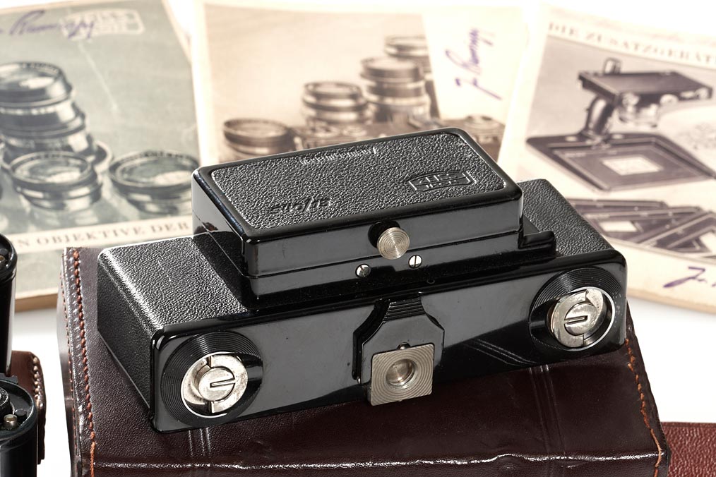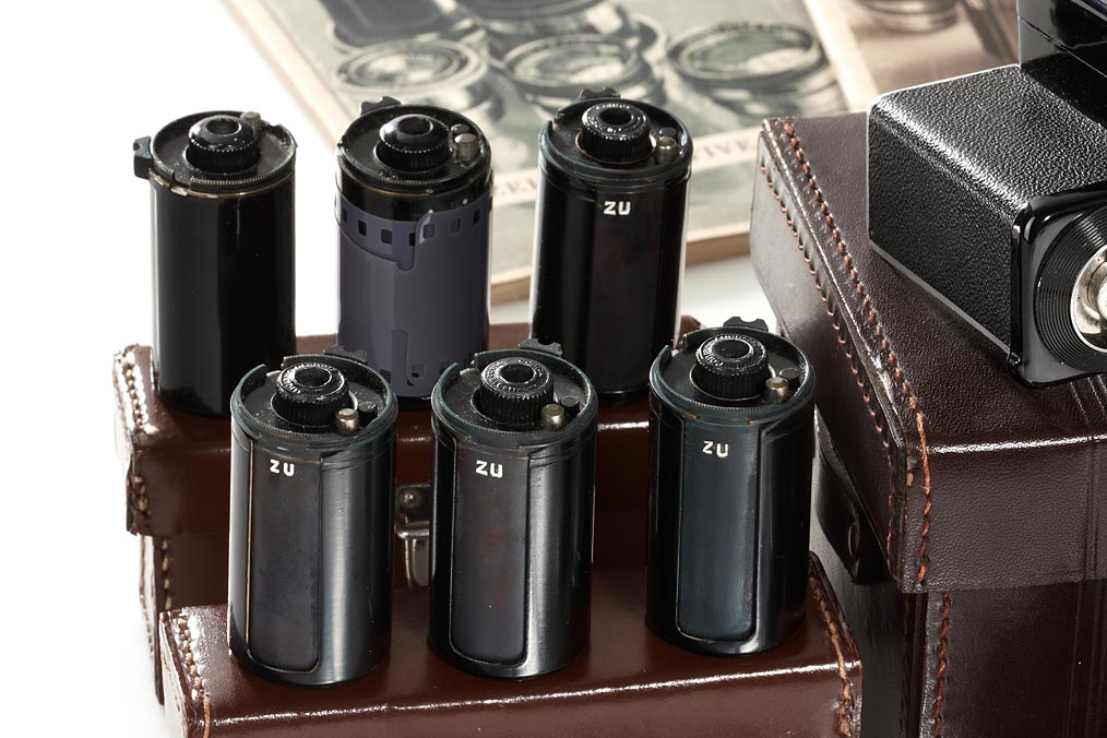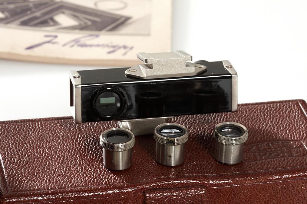 near mint magazine back 540/13 for Contax I in leather case with 7 plates and focusing screen, chrome 5&13.5cm finder 433/26, rare and early film trimming template in case, very early Contameter no. W.130 with all accessories in maker's case, 7 filters for 42mm diameter in maker's bakelite keepers, 6 film spools in cases, some literature (14)