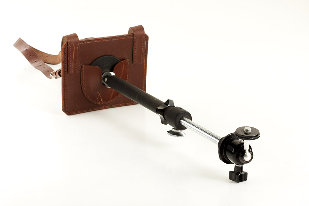 very rare Carl Zeiss Jena combination of chest tripod and repro unit for Contax. The linkage can be screwed of the repro unit and can be hung up into the leather belt. All adjustable over push buttons and screws. All with Carl Zeiss Jena inscriptions.
