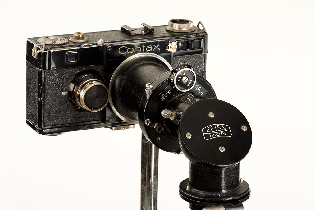 very rare outfit including stand for Contax with Contax I no.V.31312 (synchronized, shutter inoperable), prism attachment, Carl Zeiss Jena microscope no.286505, illuminator, mounted on original wooden board - a similar outfit is illustrated in Kuc I page 234