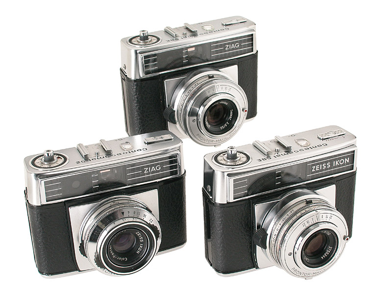 1. SBE mit Tessar 2,8/50 mm, Prontor-Matic 500 SL, Jüttner 5.043.01, Gravur auf Rückseite: "ZI-KD 5" = Kundendienst / Leihkamera.- selten ! 2. SE mit Color-Pantar 2,8/45 mm. Prontor-Matic 500, Jüttner 5.044.01, "ZIAG"-Logo im Frontfenster. 3. SBE mit Tessar 2,8/50 mm.Prontor-Matic 500 SL, Jüttner 5.043.01, "ZIAG"-Logo im Frontfenster. (3)