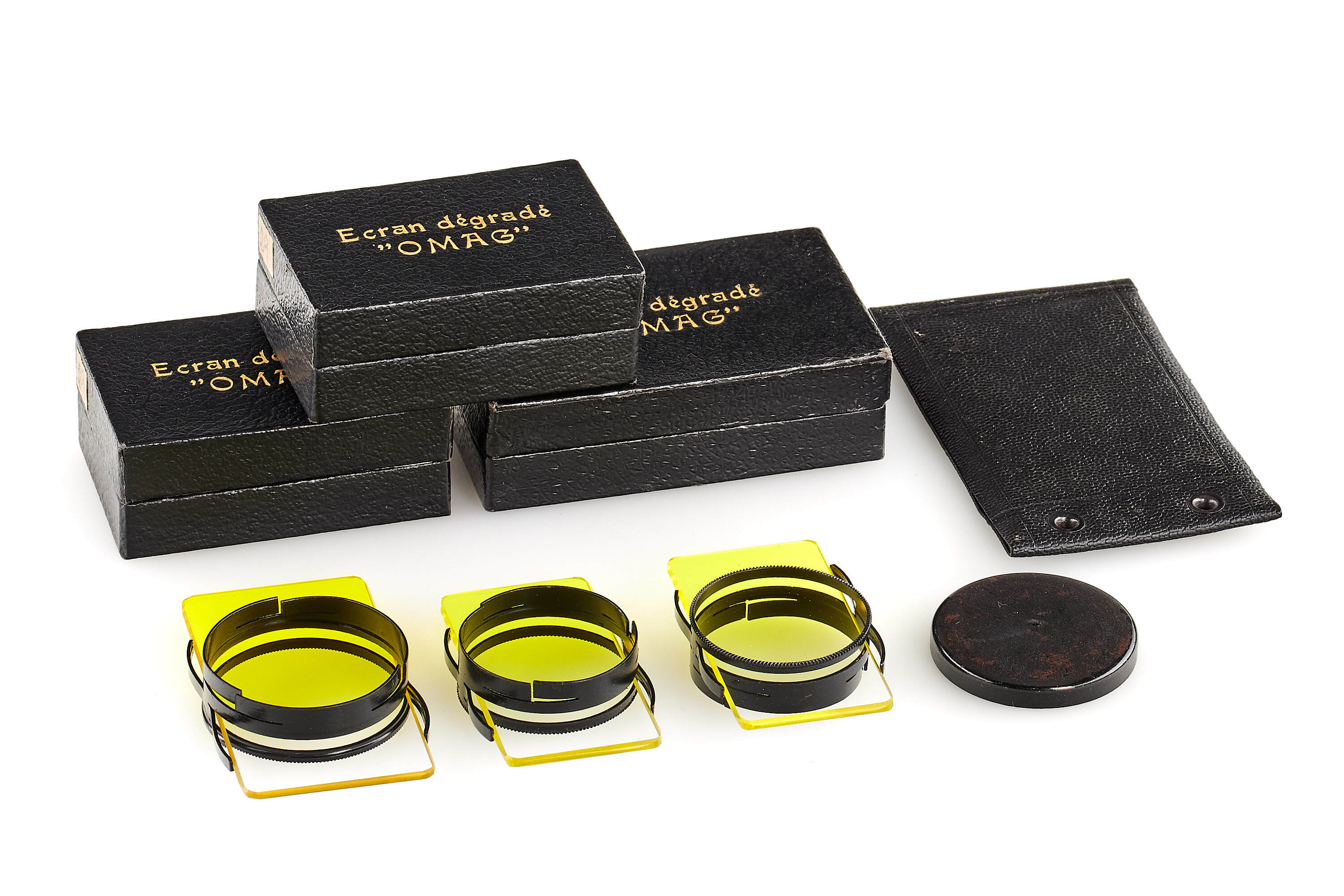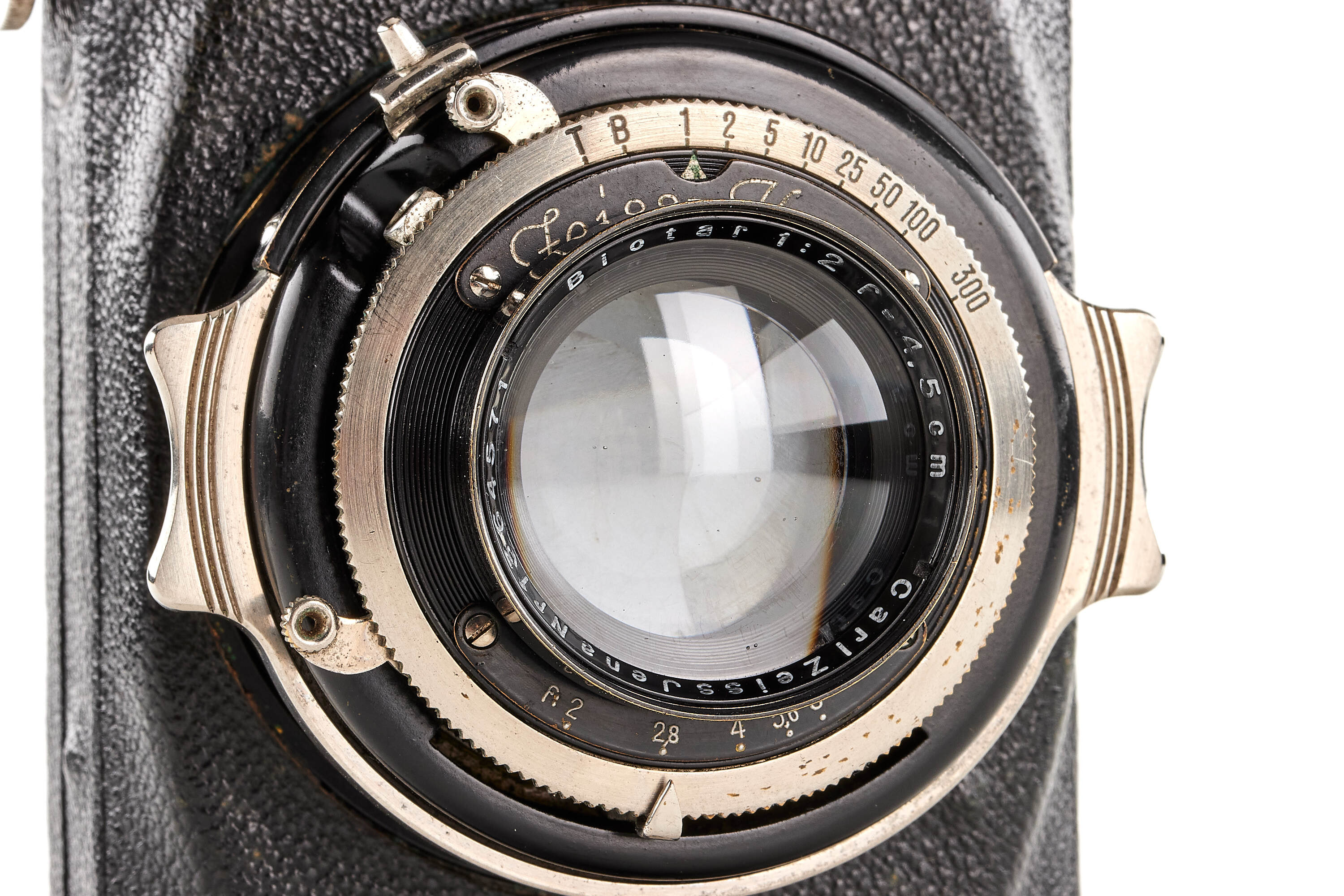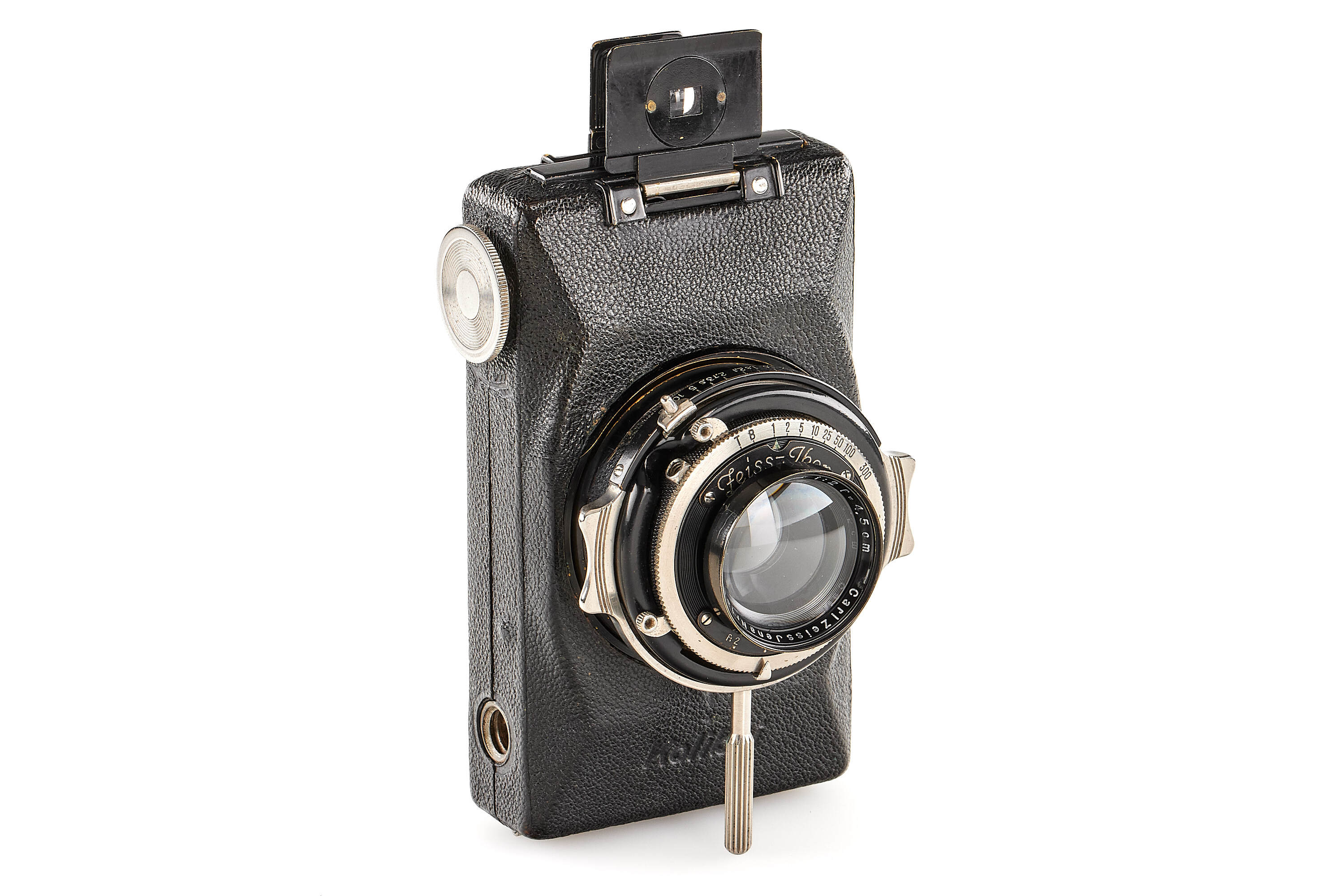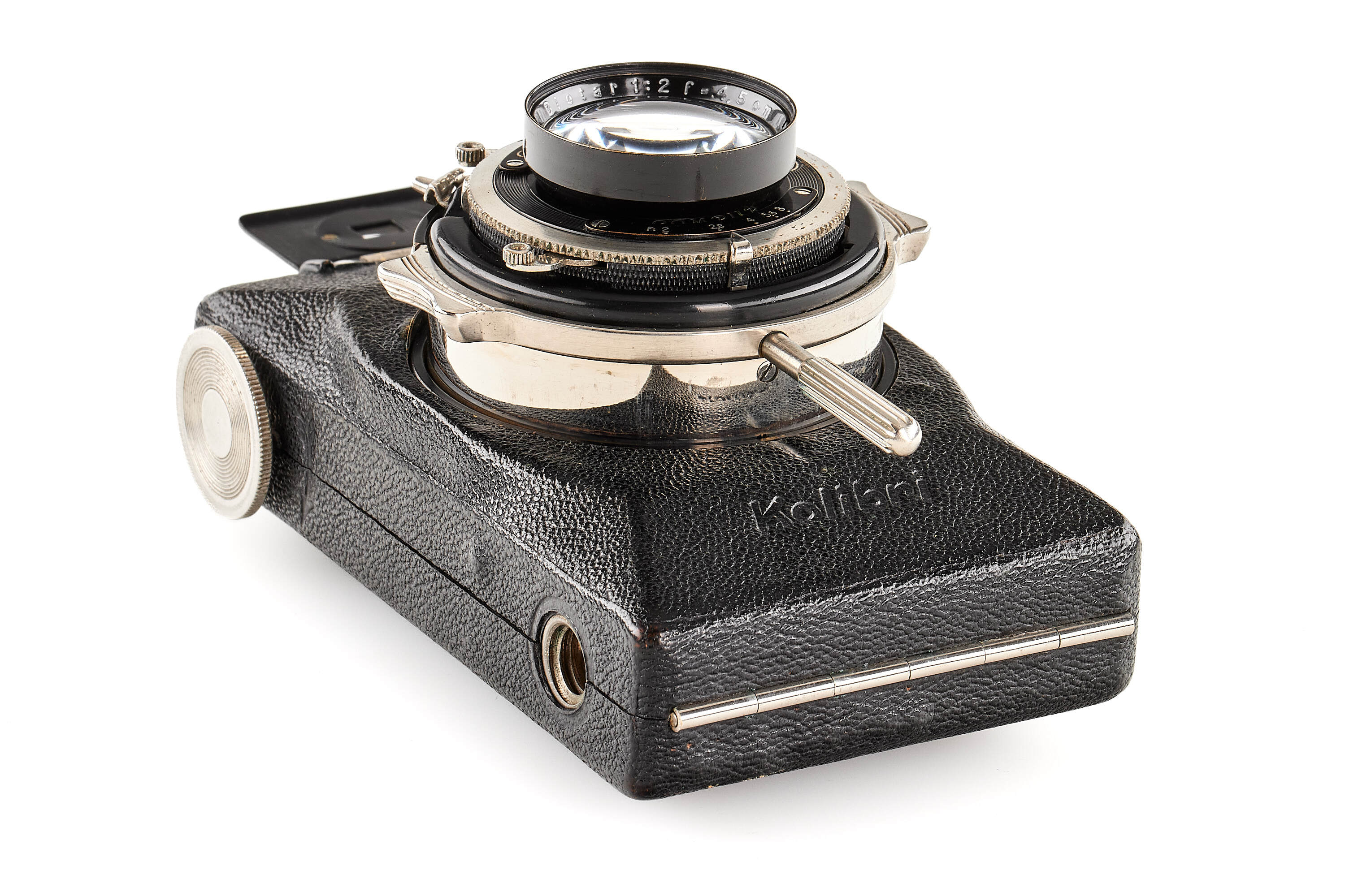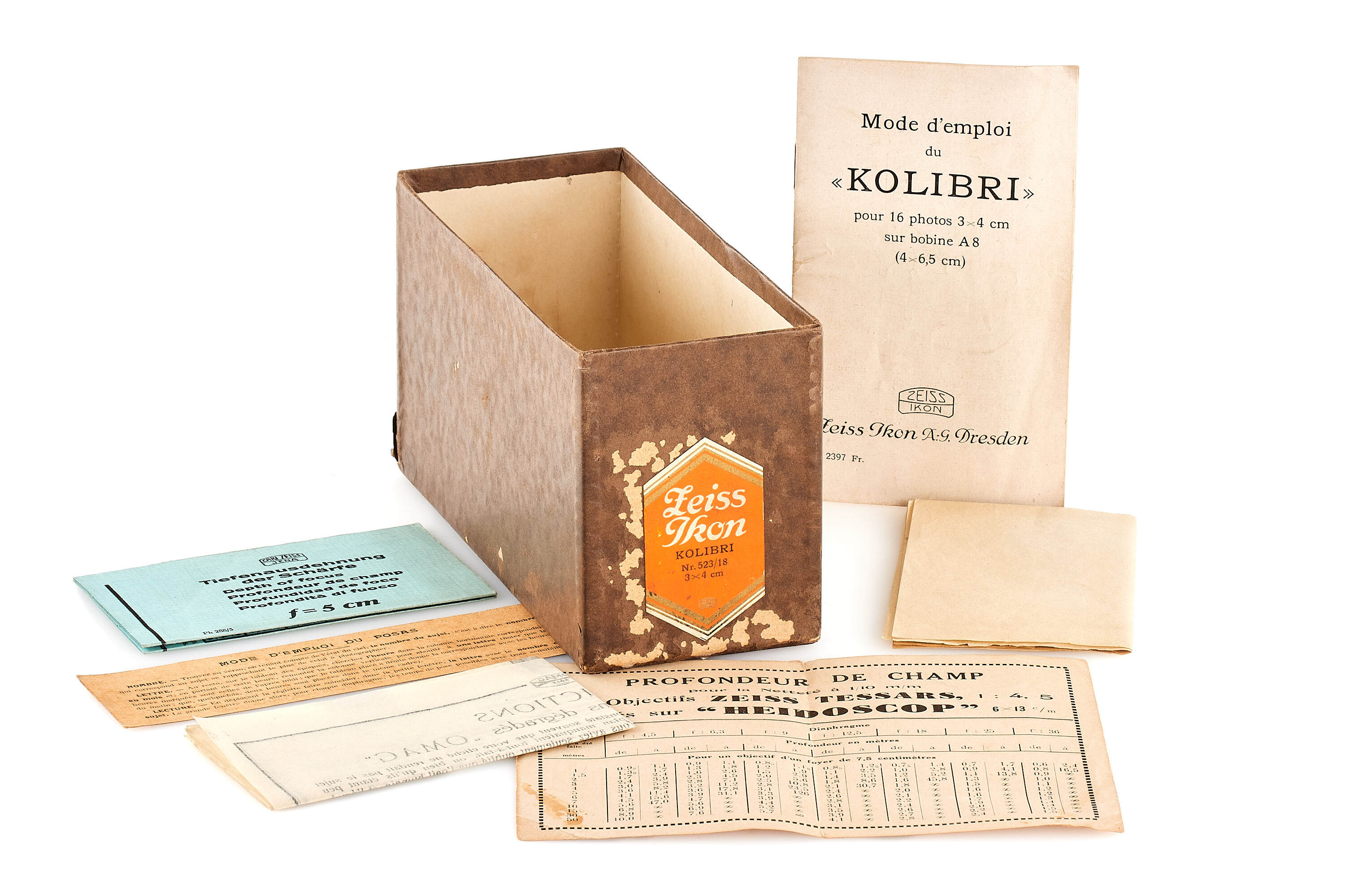 Rare Night Kolibri with fast Biotar 2/4.5cm no.1364571, good optics only showing a few light cleaning marks, complete set with a detachable stand, lens cap, 3x color filters (with maker's boxes), negatives album, French instructions and papers, with maker's box (top missing).
