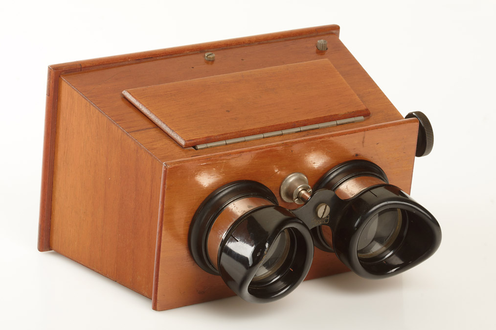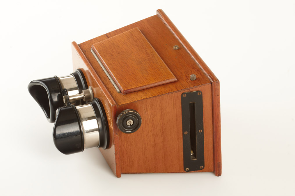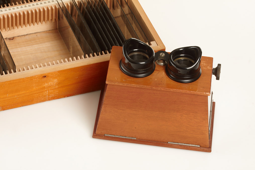 Brewster type stereo viewer in fine condition with adjustable eye piece, with a set of approx. 56 stereo negatives in fitted wooden box