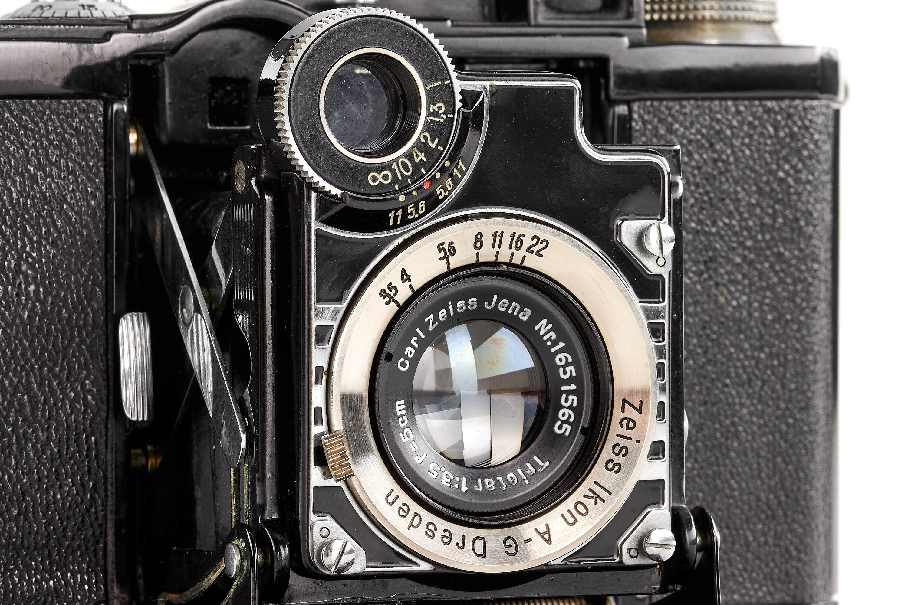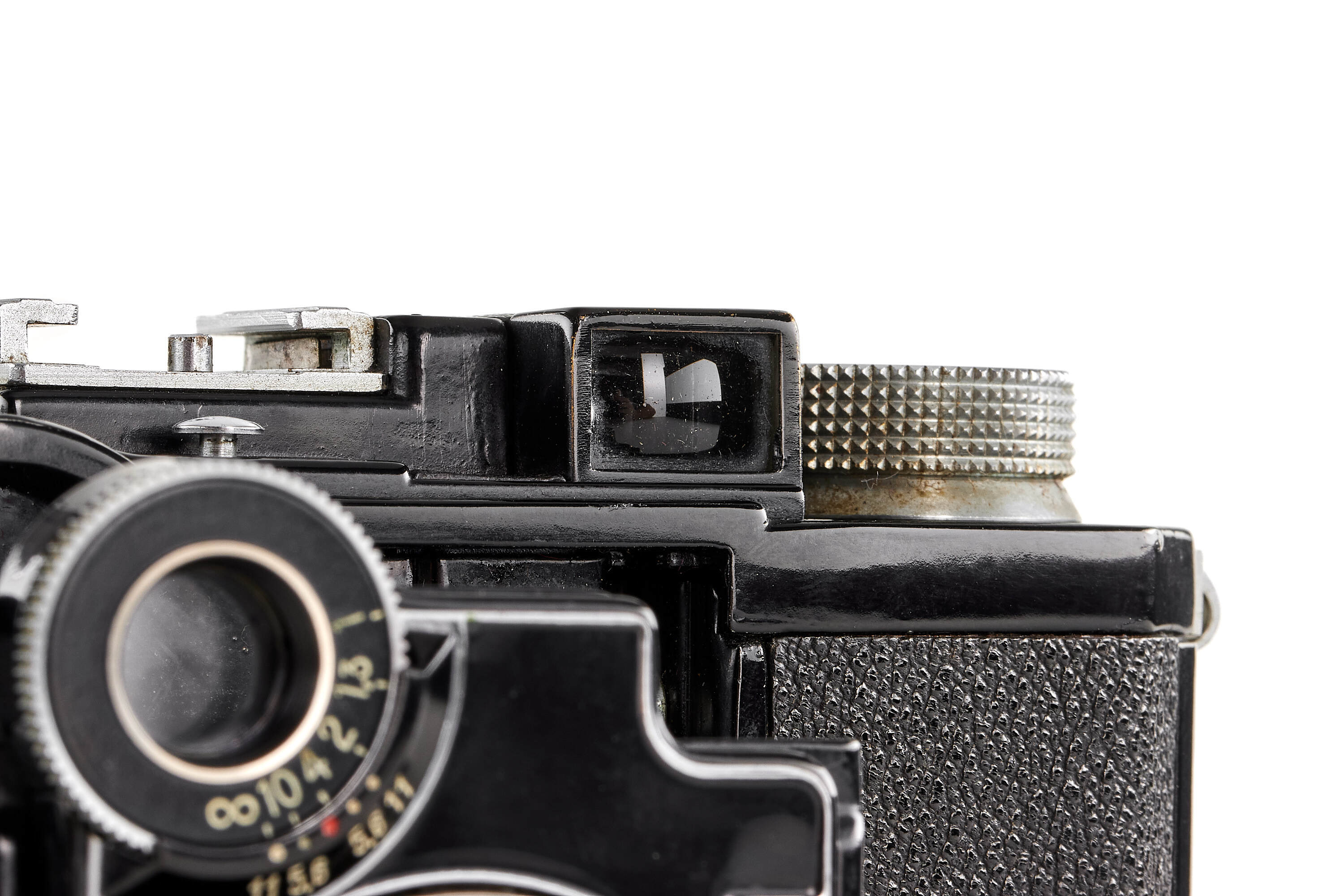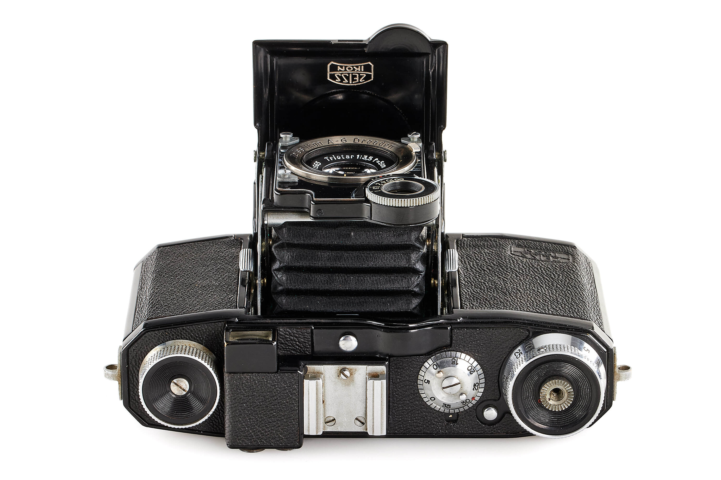 Rare very early folding 35mm rangefinder camera, first version black/nickel with black focusing scale, in outstanding, mint condition, smooth focus and aperture, with Triotar 3.5/5cm no.1651565 with good optics, with leather case (cond B+).