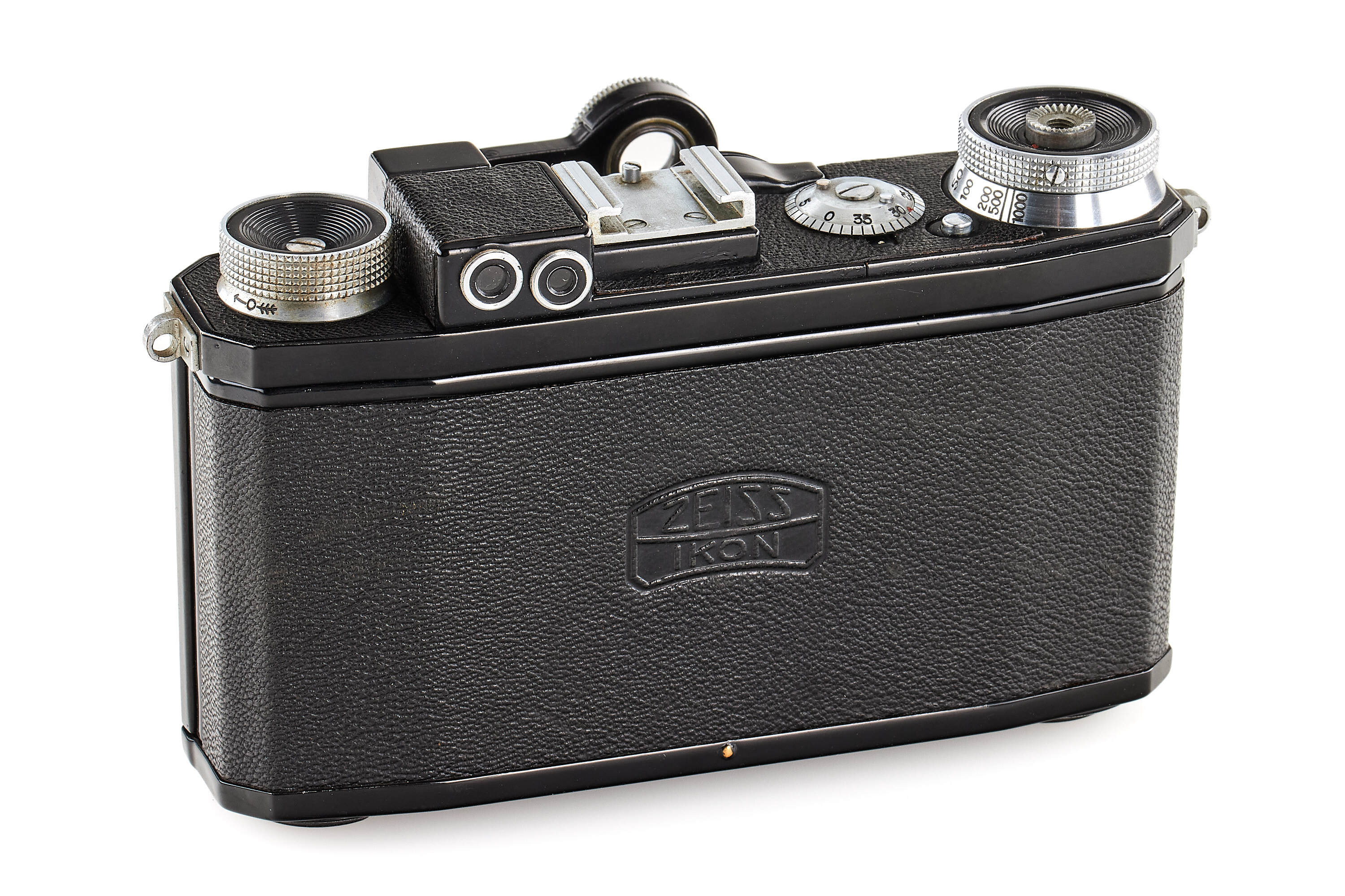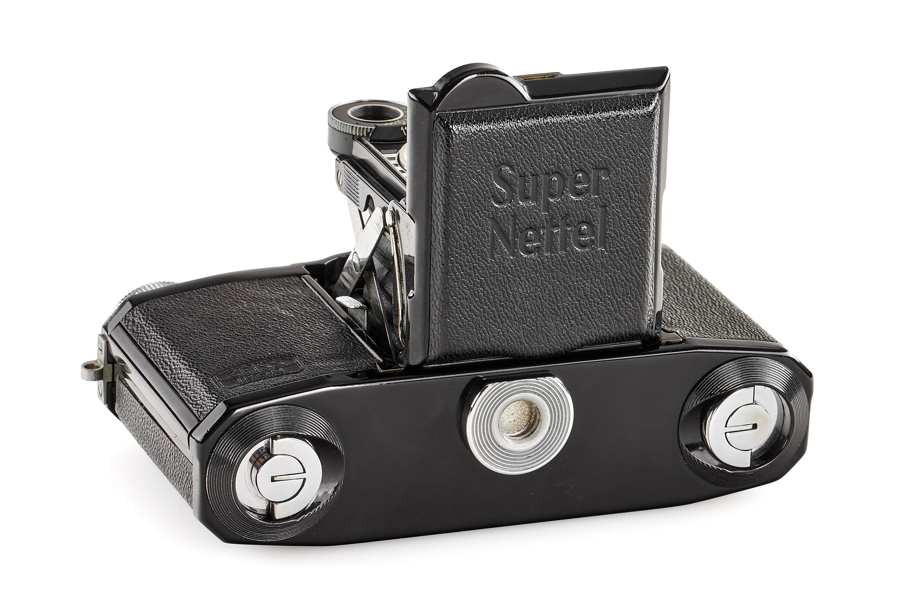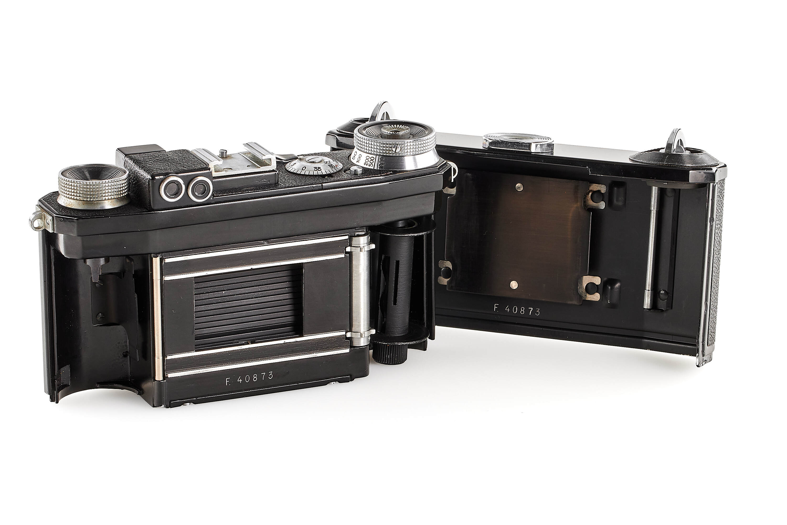 Rare very early folding 35mm rangefinder camera, first version black/nickel with black focusing scale, in outstanding, mint condition, smooth focus and aperture, with Triotar 3.5/5cm no.1651565 with good optics, with leather case (cond B+).
