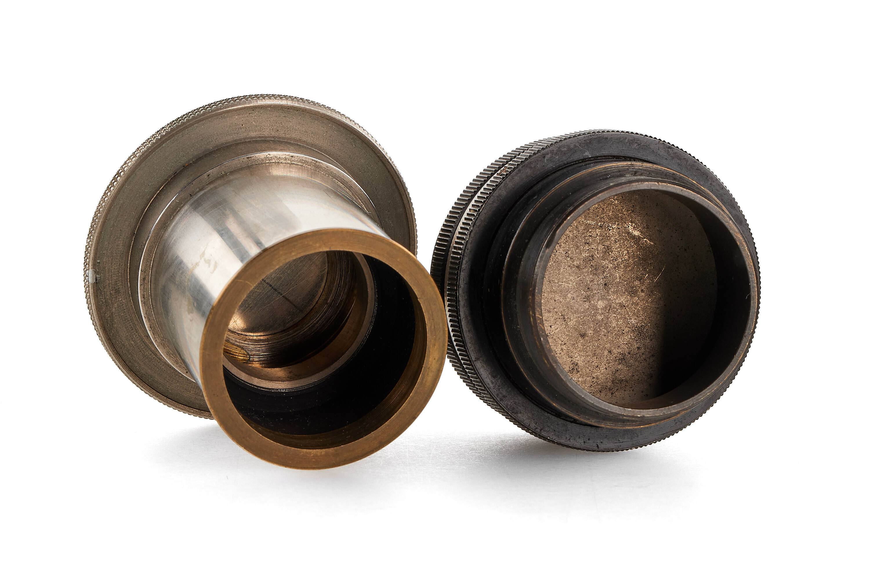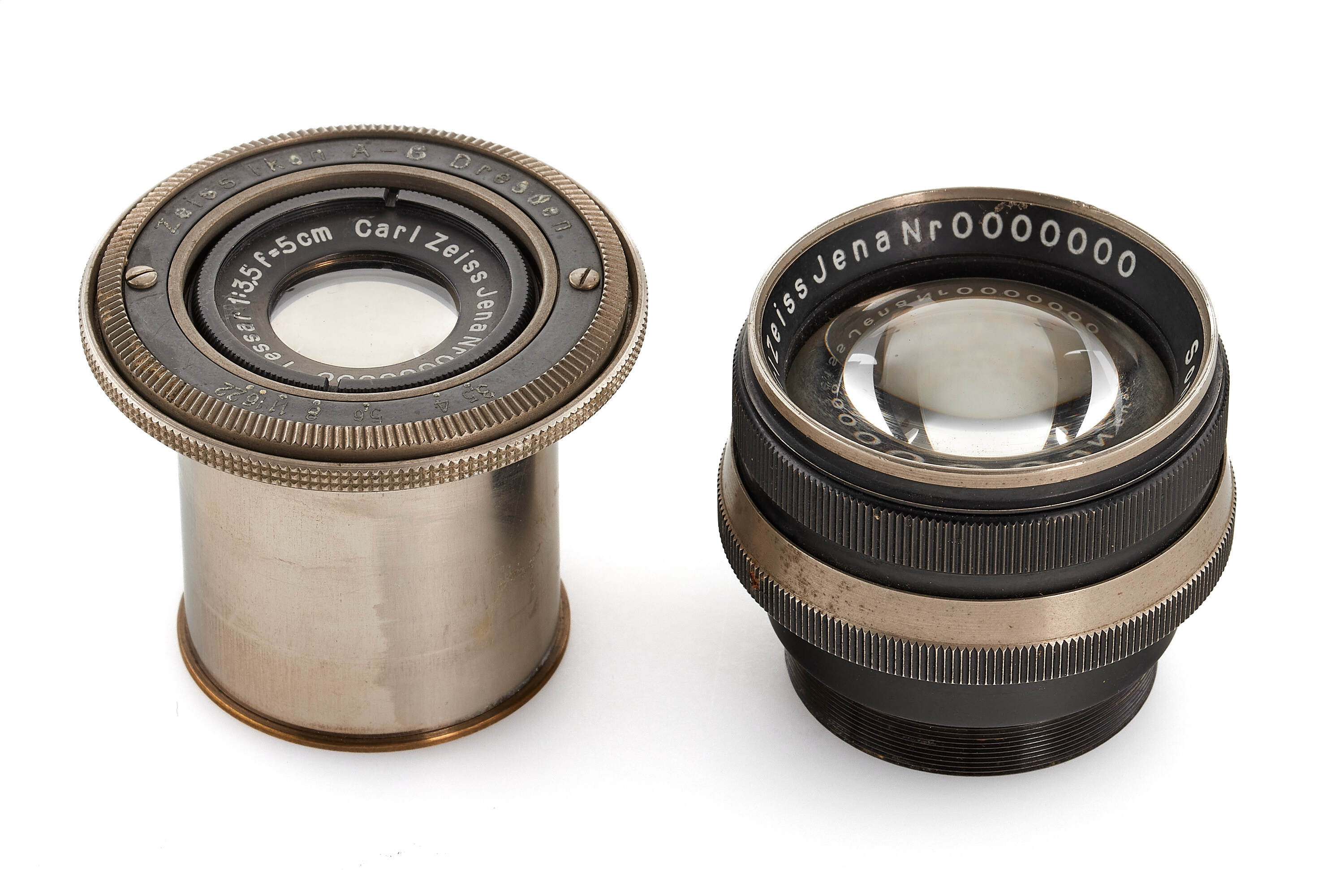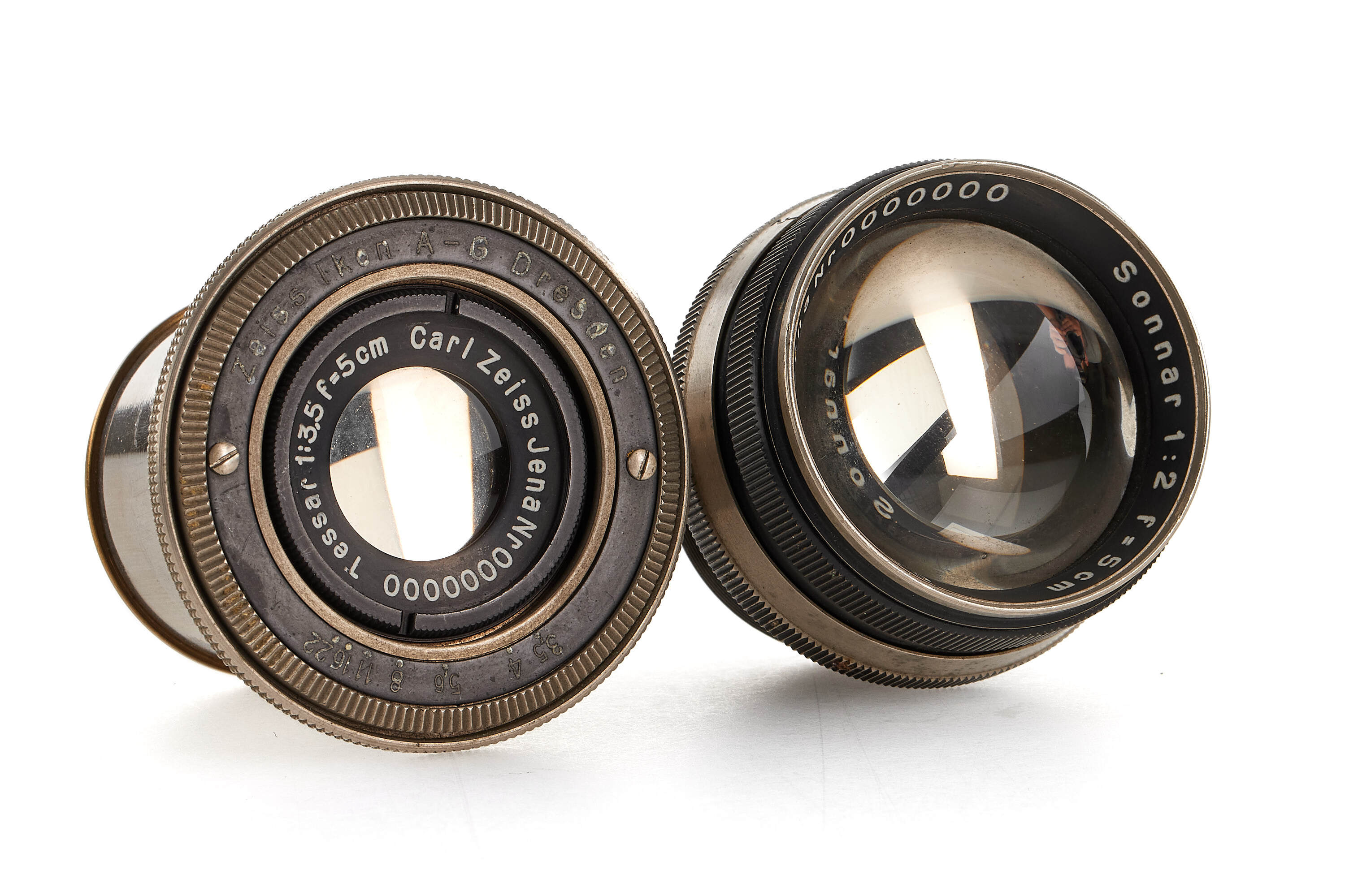 A set of very rare early original dummy lenses for Contax (for display), black/nickel Sonnar 2/5cm and Tessar 2.8/5cm, both with typical "Attrappe" no.0000000, non movable front part only, without aperture, in almost mint condition.
