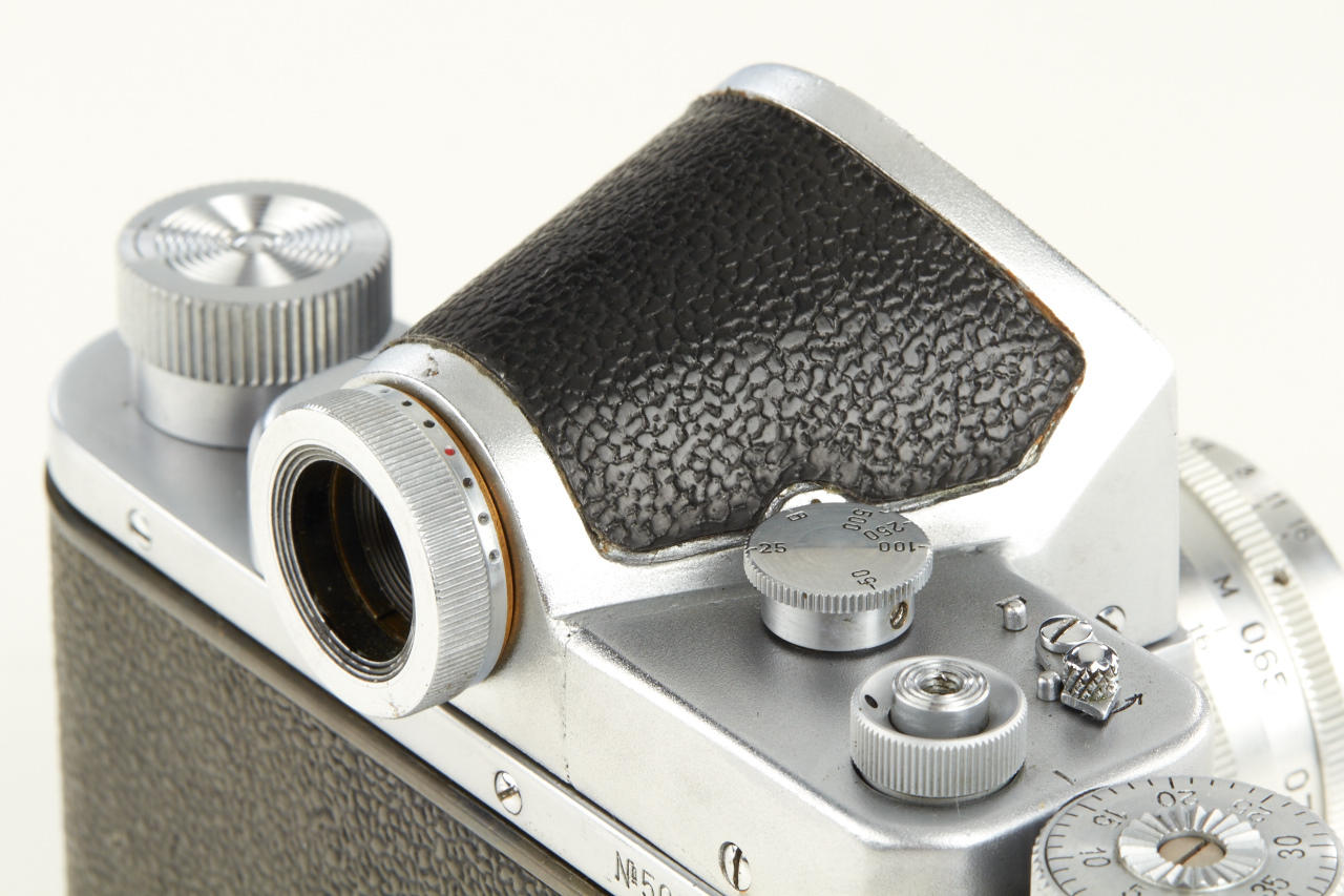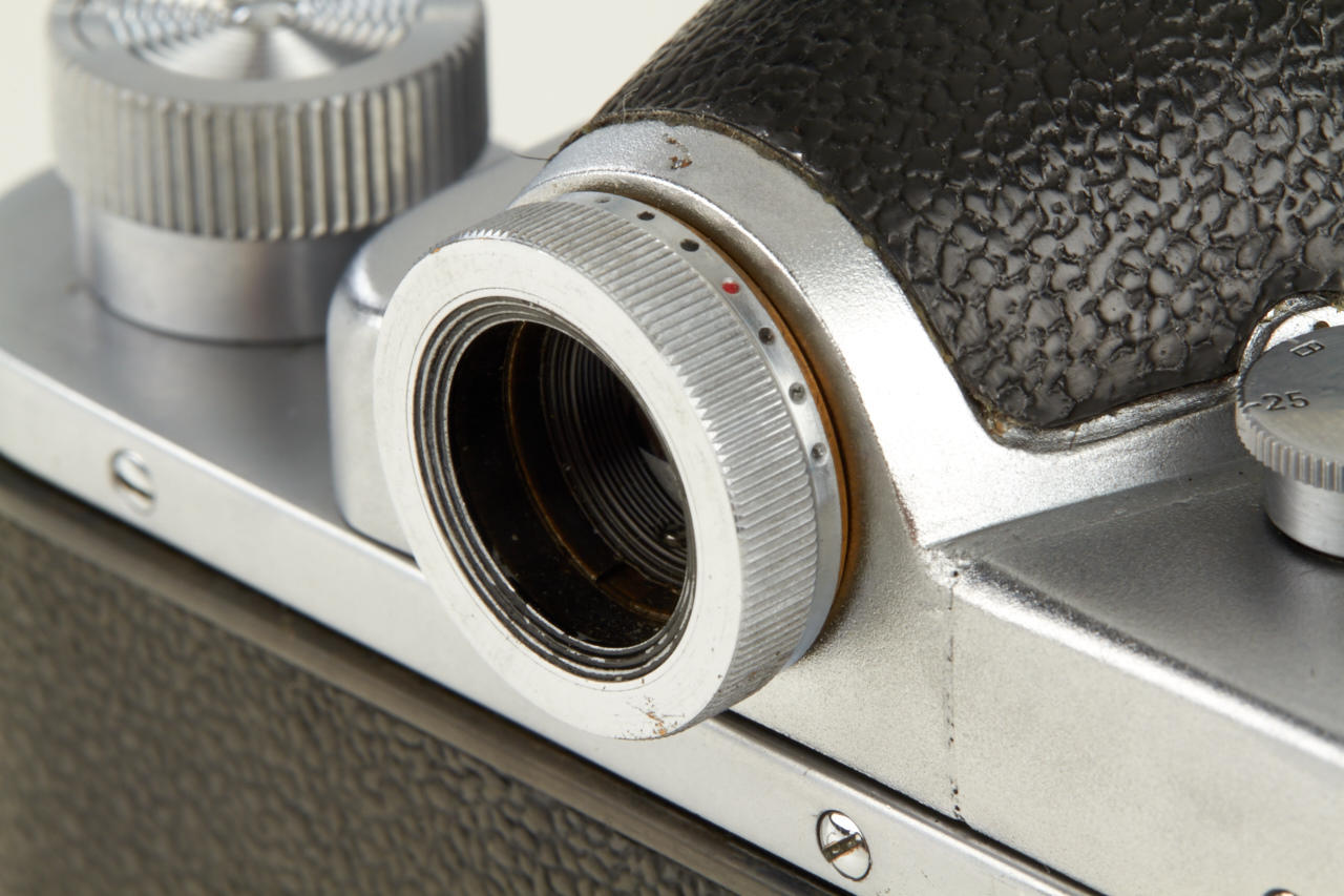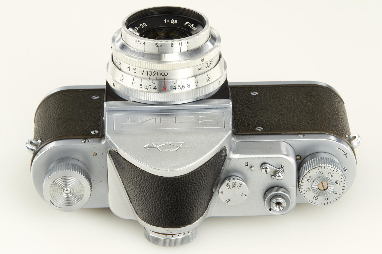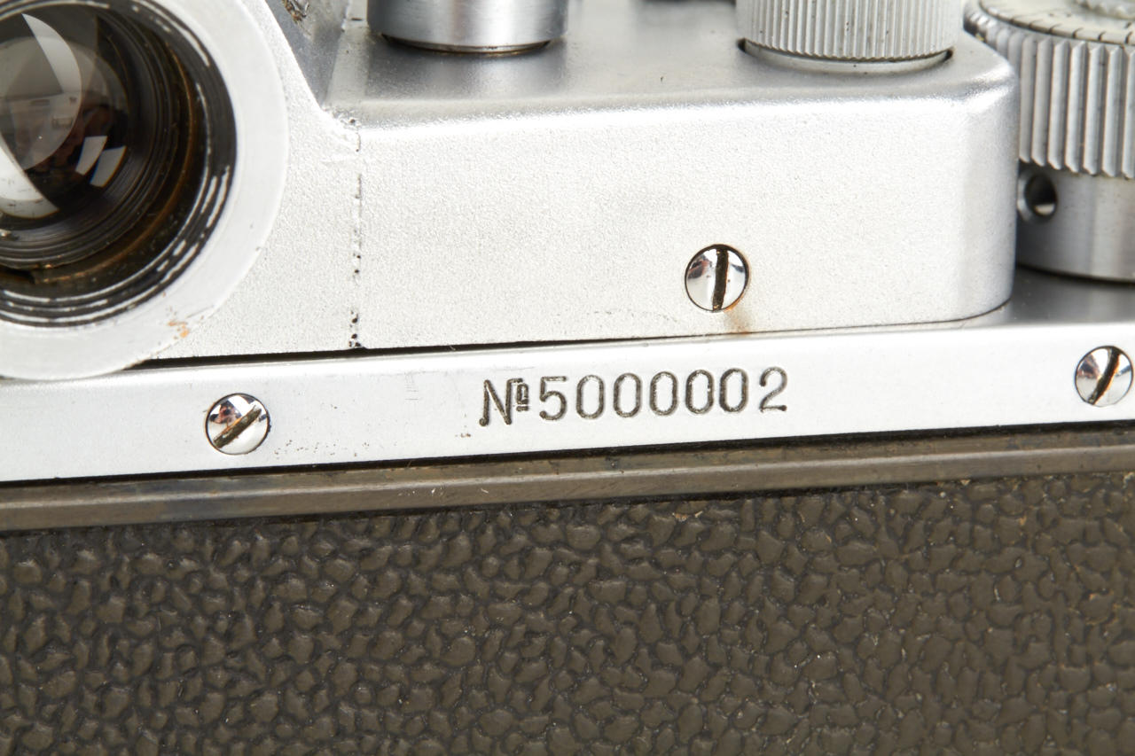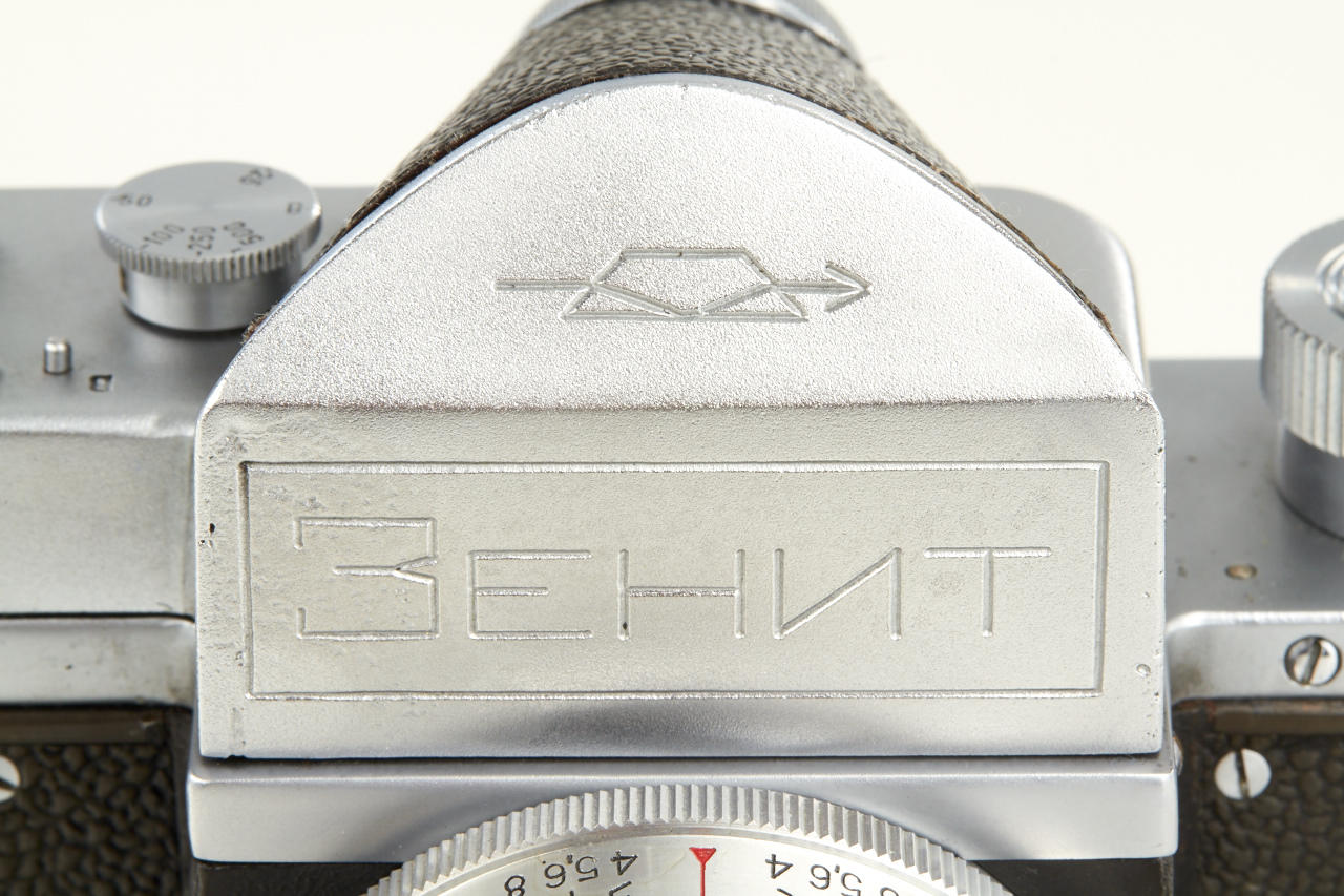 well preserved Zenit pre series or test camera engraved No. 5000002 from the property of an employee of KMZ. Most of its characteristics are those of an early Zenit, e.g. the “Square Logo”, while it still has a few minor details in common with the first prototypes of the Zenit as well. It mainly differs from the series model by the execution of the prism housing and the eyepiece, which both seem to be one of a kind. Dr. Milos Mladek, well-known expert in Russian cameras writes in his expertise: 'After a thorough examination of the camera and after having compared it extensively with both a Zenit prototype and a “Square Logo” model Zenit, we consider this camera a KMZ factory research model that was very probably made just before the series production of the regular Zenit to test the new rounded shape of the prism housing and moreover to test a special diopter-adjustable eyepiece (+/- 3 diopters, three lenses in a non-rotating mount, very well made - regrettably it later did not make it into series production). It always was highly unlikely that KMZ would have started series production of the regular Zenit body without having tested the new shape of the prism housing: here is the test sample. - It comes with a later lens, cap and case'