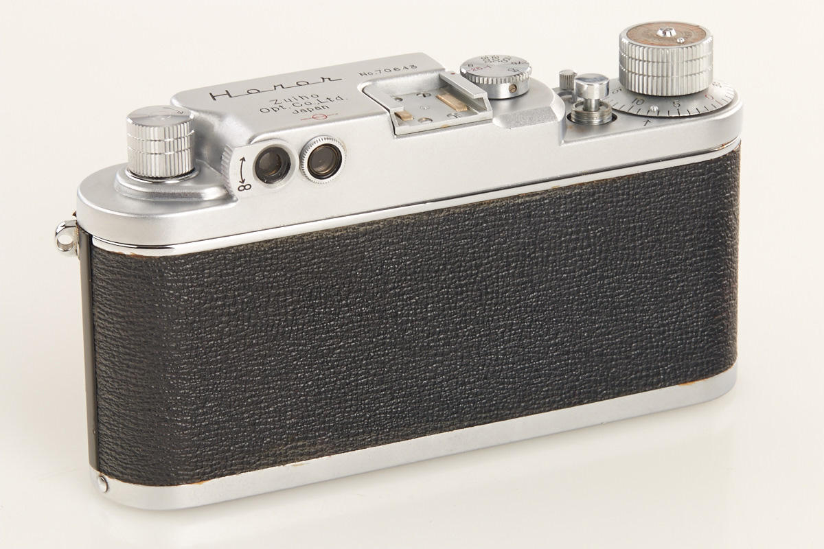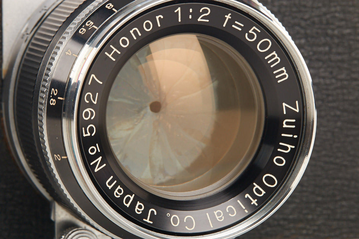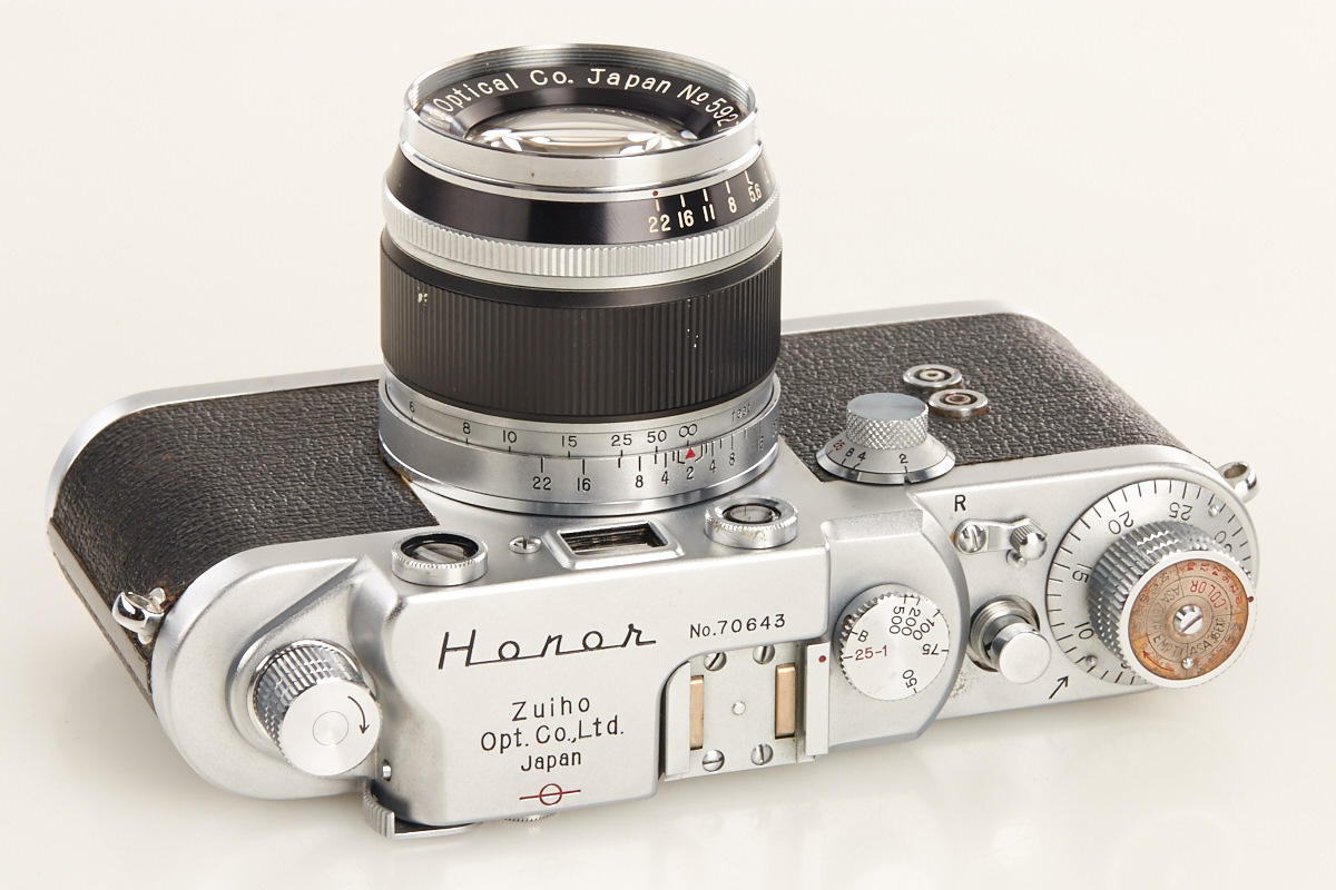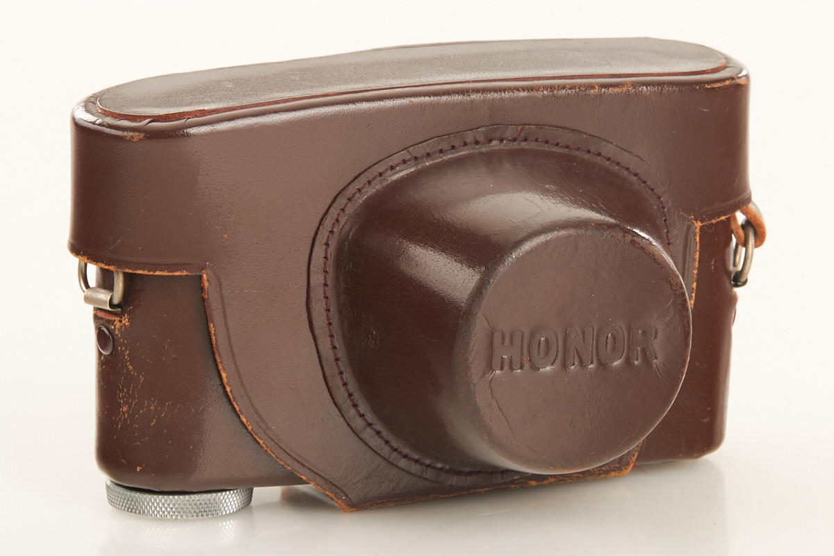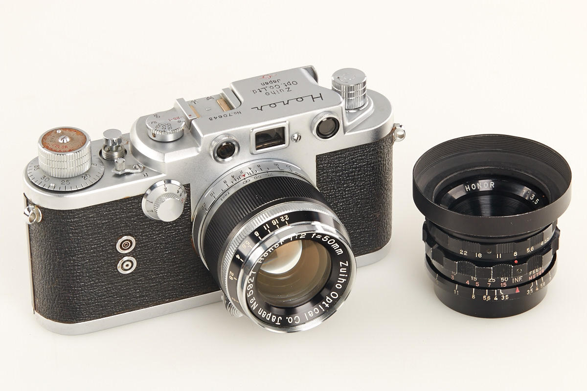 very rare Leica copy in fine condition, type II with matching Zuiho Honor 2/50mm no.5927 (clean lenses) and very rare all-black Honor 3.5/35mm K. no.10191 (hood, cap), Honor everready case