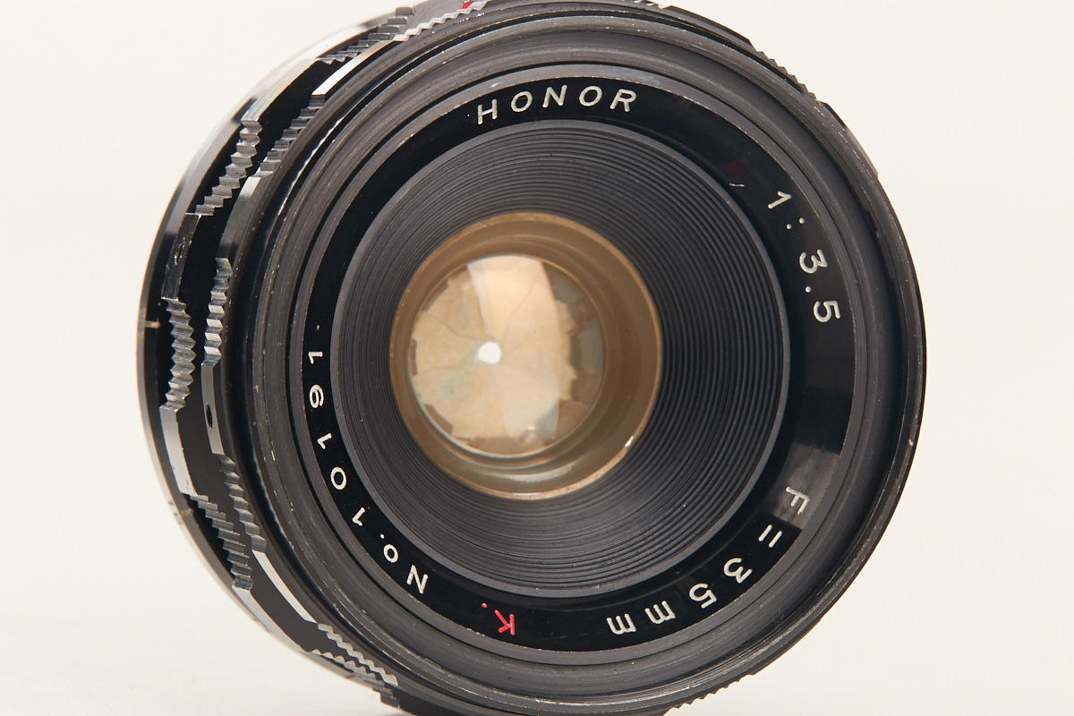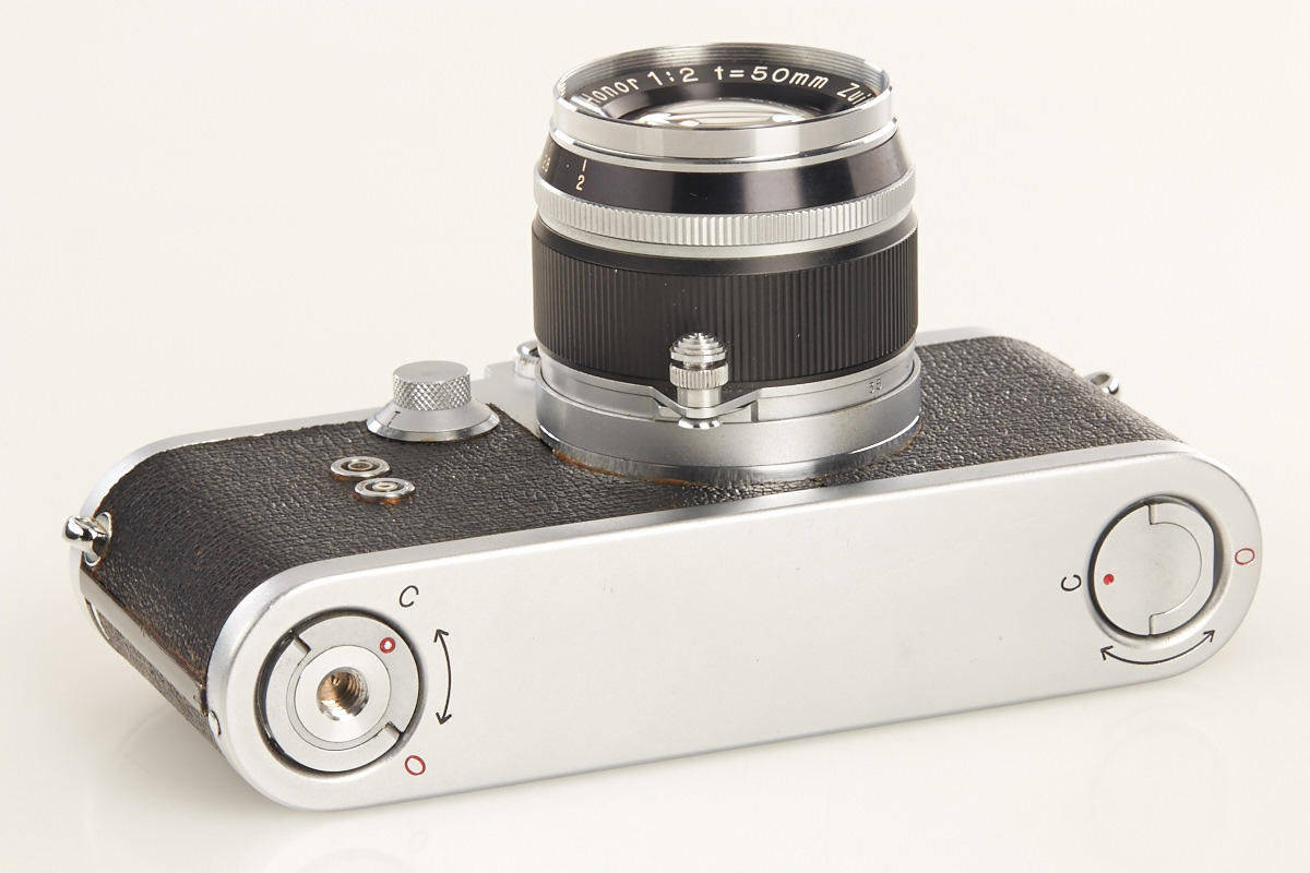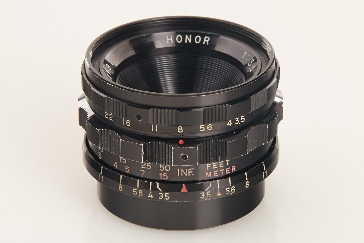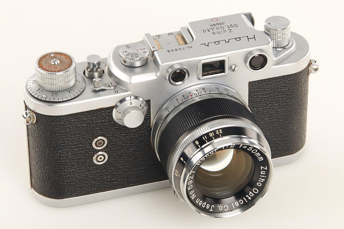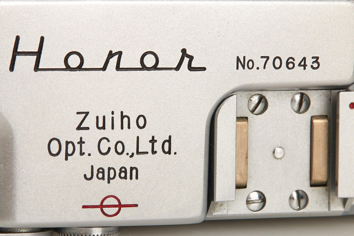 very rare Leica copy in fine condition, type II with matching Zuiho Honor 2/50mm no.5927 (clean lenses) and very rare all-black Honor 3.5/35mm K. no.10191 (hood, cap), Honor everready case